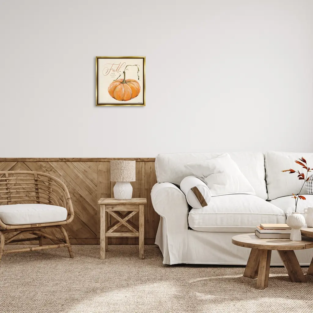 Elevate your home or office to the next level with Stupell Framed Floating Canvas Wall Art. Our premium hand-stretched canvas is mounted securely into a sturdy lightweight frame. The museum-style gap between the wrapped canvas and the box frame gives the illusion of floating artwork. Stupell Wall Art is made in the USA.Features: Dimensions: 18 x 1.7 x 18 Frame, 17 x 1.5 x 17 Canvas ArtFloating Frame Canvas Products are available in sizes 18"x18" and 25"x25". All Floating Frame Canvas Products have a 1.7" Depth.Wall Art is Ready to Hang with Hardware Free Hanging. No Installation required. For Easy Set Up Lean or Layer Artwork on Shelf or Against Wall. Artwork is Permently Fixed into the Frame.Our elevated 1.7" Thick Floating Frame is the perfect complement to our canvas style Wall Art. We use only the highest quality inks in house with industry leading printing solutions. Canvas is hand stretched over a durable wood foundation and then mounted securly into a Modern Box Frame. Made in the USA.Artwork Relates To: Seasonal, Fall, Autumn, Pumpkin, PhraseDesign by Stephanie Workman Marrott