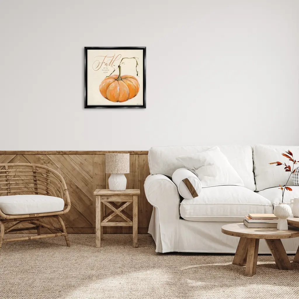 Elevate your home or office to the next level with Stupell Framed Floating Canvas Wall Art. Our premium hand-stretched canvas is mounted securely into a sturdy lightweight frame. The museum-style gap between the wrapped canvas and the box frame gives the illusion of floating artwork. Stupell Wall Art is made in the USA.Features: Dimensions: 18 x 1.7 x 18 Frame, 17 x 1.5 x 17 Canvas ArtFloating Frame Canvas Products are available in sizes 18"x18" and 25"x25". All Floating Frame Canvas Products have a 1.7" Depth.Wall Art is Ready to Hang with Hardware Free Hanging. No Installation required. For Easy Set Up Lean or Layer Artwork on Shelf or Against Wall. Artwork is Permently Fixed into the Frame.Our elevated 1.7" Thick Floating Frame is the perfect complement to our canvas style Wall Art. We use only the highest quality inks in house with industry leading printing solutions. Canvas is hand stretched over a durable wood foundation and then mounted securly into a Modern Box Frame. Made in the USA.Artwork Relates To: Seasonal, Fall, Autumn, Pumpkin, PhraseDesign by Stephanie Workman Marrott