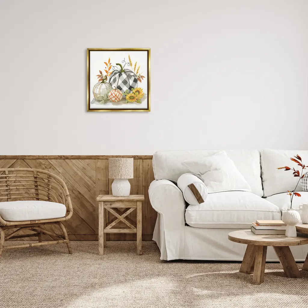 Elevate your home or office to the next level with Stupell Framed Floating Canvas Wall Art. Our premium hand-stretched canvas is mounted securely into a sturdy lightweight frame. The museum-style gap between the wrapped canvas and the box frame gives the illusion of floating artwork. Stupell Wall Art is made in the USA.Features: Dimensions: 18 x 1.7 x 18 Frame, 17 x 1.5 x 17 Canvas ArtFloating Frame Canvas Products are available in sizes 18"x18" and 25"x25". All Floating Frame Canvas Products have a 1.7" Depth.Wall Art is Ready to Hang with Hardware Free Hanging. No Installation required. For Easy Set Up Lean or Layer Artwork on Shelf or Against Wall. Artwork is Permently Fixed into the Frame.Our elevated 1.7" Thick Floating Frame is the perfect complement to our canvas style Wall Art. We use only the highest quality inks in house with industry leading printing solutions. Canvas is hand stretched over a durable wood foundation and then mounted securly into a Modern Box Frame. Made in the USA.Artwork Relates To: Seasonal, Fall, Autumn, Country, Floral, Flower, Pattern, PumpkinDesign by Nan