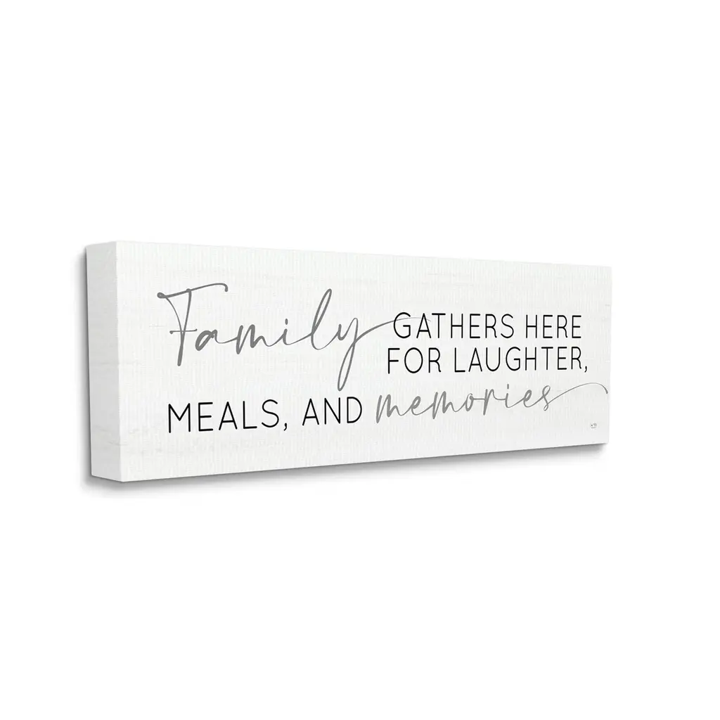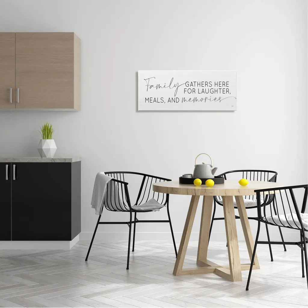 Proudly made in the USA, Our stretched canvas is created with the highest standards. We use only the highest quality inks and canvas on our in house Mimaki printers, and then hand cut and stretch each piece over a 1.5 inch thick wooden frame for hanging. The art comes ready to hang with no installation required.Features: Dimensions: 24 x 1.5 x 10 InchesStretched Canvas Sizes Include Standard: 24 x 1.5 x 10 Large: 30 x 1.5 x 13 X-Large: 40 x 1.5 x 17 Oversized: 48 x 1.5 x 20Wall Art is Ready to Hang - No Installation or Hardware Needed. For Easy Set Up Lean or Layer Artwork on Shelf or Against Wall.Our stretched canvas is created with the highest standards. We use only the highest quality inks and canvas on our in house Mimaki printers, and then hand cut and stretch each piece over a 1.5 inch thick wooden frame for hanging. Made In USA.Artwork Relates To: Food, Meal, Kitchen, FamilyDesign by Lux + Me DesignsFirst perfectly in any Kitchen, Dining Room, Bar or Pantry.Text Includes: Family Gathers Here For Laughter, Meals, And Memories