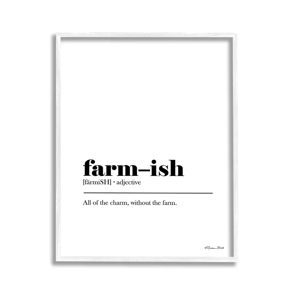 Add dimension to any room with our textured Framed Giclee Artwork. Our framed artwork is securely mounted into a 1.5-inch thick wood grain frame and ready to hang. Frames are available in three alluring styles: black, gray farmhouse and white. In addition, you should check out our oversized options if you want a statement piece. Stupell Wall Art is made in the USA.Features: Dimensions: 11 x 1.5 x 14 FramedFramed Giclee Products are available in the sizes 11"x14", 16"x20" or 24"x30". All Framed Giclee Products have a 1.5" Depth. Wall Art is Ready to Hang with Hardware Free Hanging. No installation required. For Easy Set Up Lean or Layer Artwork on Shelf or Against Wall.Our giclée prints are carefully mounted on a durable MDF backing, and then perfectly finished in a 1.5 inch thick woodgrain frame. Mounted frame colors include black, gray farmhouse and white. Made In USA.Artwork Relates To: Bathroom, Funny, Humor, Definition, All of the charm without the farmDesign by Susan Ball