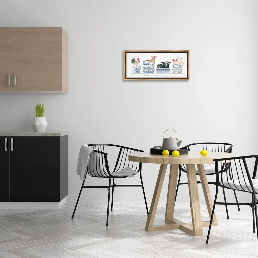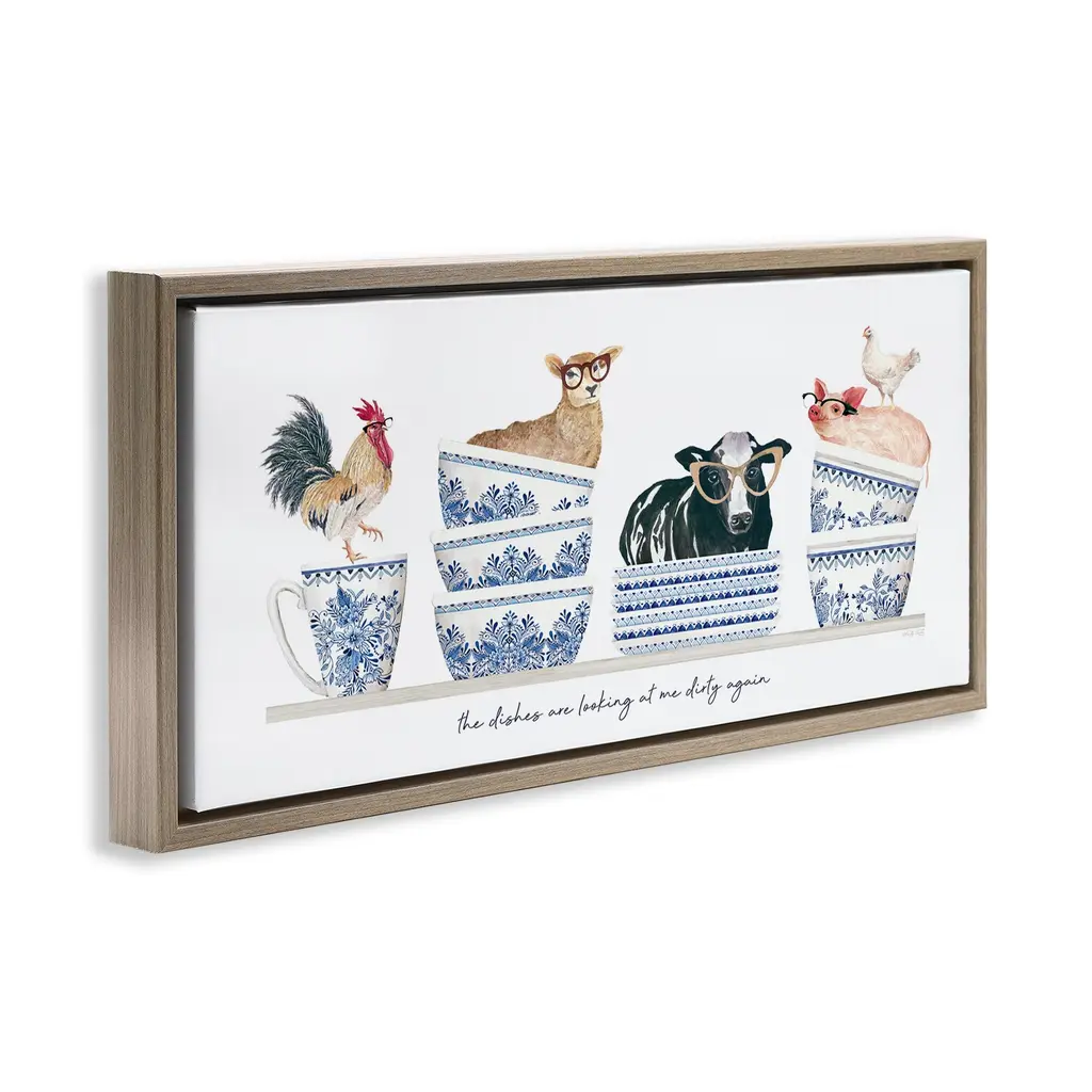 Elevate your home or office to the next level with Stupell Framed Floating Canvas Wall Art. Our premium hand-stretched canvas is mounted securely into a sturdy lightweight frame. The museum-style gap between the wrapped canvas and the box frame gives the illusion of floating artwork. Stupell Wall Art is made in the USA.Features: Dimensions: 25 x 1.7 x 11 Frame, 24 x 1.5 x 10 Canvas ArtFloating Frame Canvas Products are available in sizes 25"x11" and 31"x14". All Floating Frame Canvas Products have a 1.7" Depth.Wall Art is Ready to Hang with Hardware Free Hanging. No Installation required. For Easy Set Up Lean or Layer Artwork on Shelf or Against Wall. Artwork is Permently Fixed into the Frame.Our elevated 1.7" Thick Floating Frame is the perfect complement to our canvas style Wall Art. We use only the highest quality inks in house with industry leading printing solutions. Canvas is hand stretched over a durable wood foundation and then mounted securly into a Modern Box Frame. Made in the USA.Artwork Relates To: Cup, Animal, Bird, Chicken, Cow, Mammal, Coffee Cup, Rooster, Pig, Farmhouse, Country, Mug, Kitchen, The Dishes are Looking at me Dirty AgainDesign by Cindy Jacobs