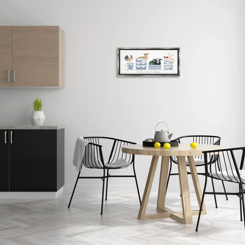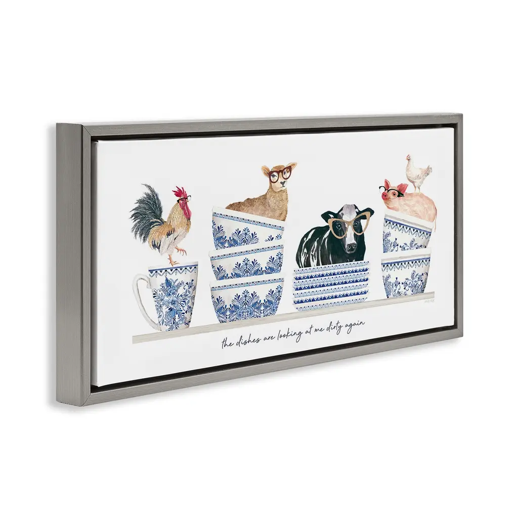 Elevate your home or office to the next level with Stupell Framed Floating Canvas Wall Art. Our premium hand-stretched canvas is mounted securely into a sturdy lightweight frame. The museum-style gap between the wrapped canvas and the box frame gives the illusion of floating artwork. Stupell Wall Art is made in the USA.Features: Dimensions: 25 x 1.7 x 11 Frame, 24 x 1.5 x 10 Canvas ArtFloating Frame Canvas Products are available in sizes 25"x11" and 31"x14". All Floating Frame Canvas Products have a 1.7" Depth.Wall Art is Ready to Hang with Hardware Free Hanging. No Installation required. For Easy Set Up Lean or Layer Artwork on Shelf or Against Wall. Artwork is Permently Fixed into the Frame.Our elevated 1.7" Thick Floating Frame is the perfect complement to our canvas style Wall Art. We use only the highest quality inks in house with industry leading printing solutions. Canvas is hand stretched over a durable wood foundation and then mounted securly into a Modern Box Frame. Made in the USA.Artwork Relates To: Cup, Animal, Bird, Chicken, Cow, Mammal, Coffee Cup, Rooster, Pig, Farmhouse, Country, Mug, Kitchen, The Dishes are Looking at me Dirty AgainDesign by Cindy Jacobs