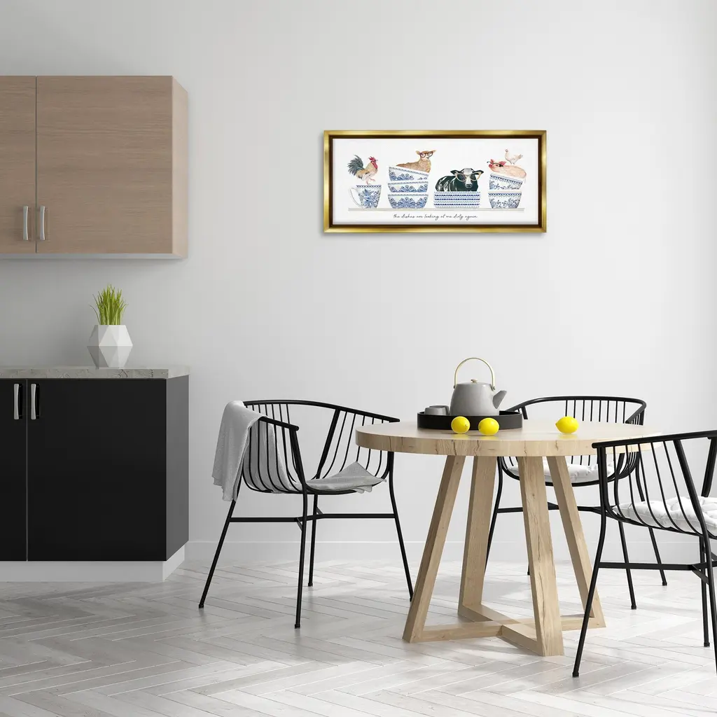 Elevate your home or office to the next level with Stupell Framed Floating Canvas Wall Art. Our premium hand-stretched canvas is mounted securely into a sturdy lightweight frame. The museum-style gap between the wrapped canvas and the box frame gives the illusion of floating artwork. Stupell Wall Art is made in the USA.Features: Dimensions: 25 x 1.7 x 11 Frame, 24 x 1.5 x 10 Canvas ArtFloating Frame Canvas Products are available in sizes 25"x11" and 31"x14". All Floating Frame Canvas Products have a 1.7" Depth.Wall Art is Ready to Hang with Hardware Free Hanging. No Installation required. For Easy Set Up Lean or Layer Artwork on Shelf or Against Wall. Artwork is Permently Fixed into the Frame.Our elevated 1.7" Thick Floating Frame is the perfect complement to our canvas style Wall Art. We use only the highest quality inks in house with industry leading printing solutions. Canvas is hand stretched over a durable wood foundation and then mounted securly into a Modern Box Frame. Made in the USA.Artwork Relates To: Cup, Animal, Bird, Chicken, Cow, Mammal, Coffee Cup, Rooster, Pig, Farmhouse, Country, Mug, Kitchen, The Dishes are Looking at me Dirty AgainDesign by Cindy Jacobs