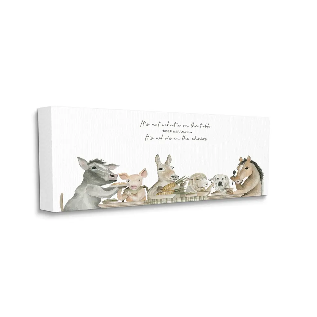 We create our stretched canvas to the highest standards. Using only the highest quality inks and canvas on Mimaki printers, we hand-cut and stretch each piece over a 1.5-inch thick wooden frame for hanging. As a result, the art comes ready to hang on the sturdy ledge with no installation required. Stupell Wall Art is made in the USA.Features: Dimensions: 24 x 1.5 x 10 InchesStretched Canvas Sizes Include Standard: 24 x 1.5 x 10 Large: 30 x 1.5 x 13 X-Large: 40 x 1.5 x 17 Oversized: 48 x 1.5 x 20Wall Art is Ready to Hang with Hardware Free Hanging. No installation required. For Easy Set Up Lean or Layer Artwork on Shelf or Against Wall.Our stretched canvas is created with the highest standards. We use only the highest quality inks and canvas on our in house Mimaki printers, and then hand cut and stretch each piece over a 1.5 inch thick wooden frame for hanging. Made In USA.Artwork Relates To: Cup, Kitchen, Table, Animal, Cattle, Mammal, Cow, Farm Animal, Horse, Pig, Sheep, Dog, Coffee, Coffee Cup, It's Not What's on the Table That Matters... It's Who's in the ChairsDesign by Cindy Jacobs