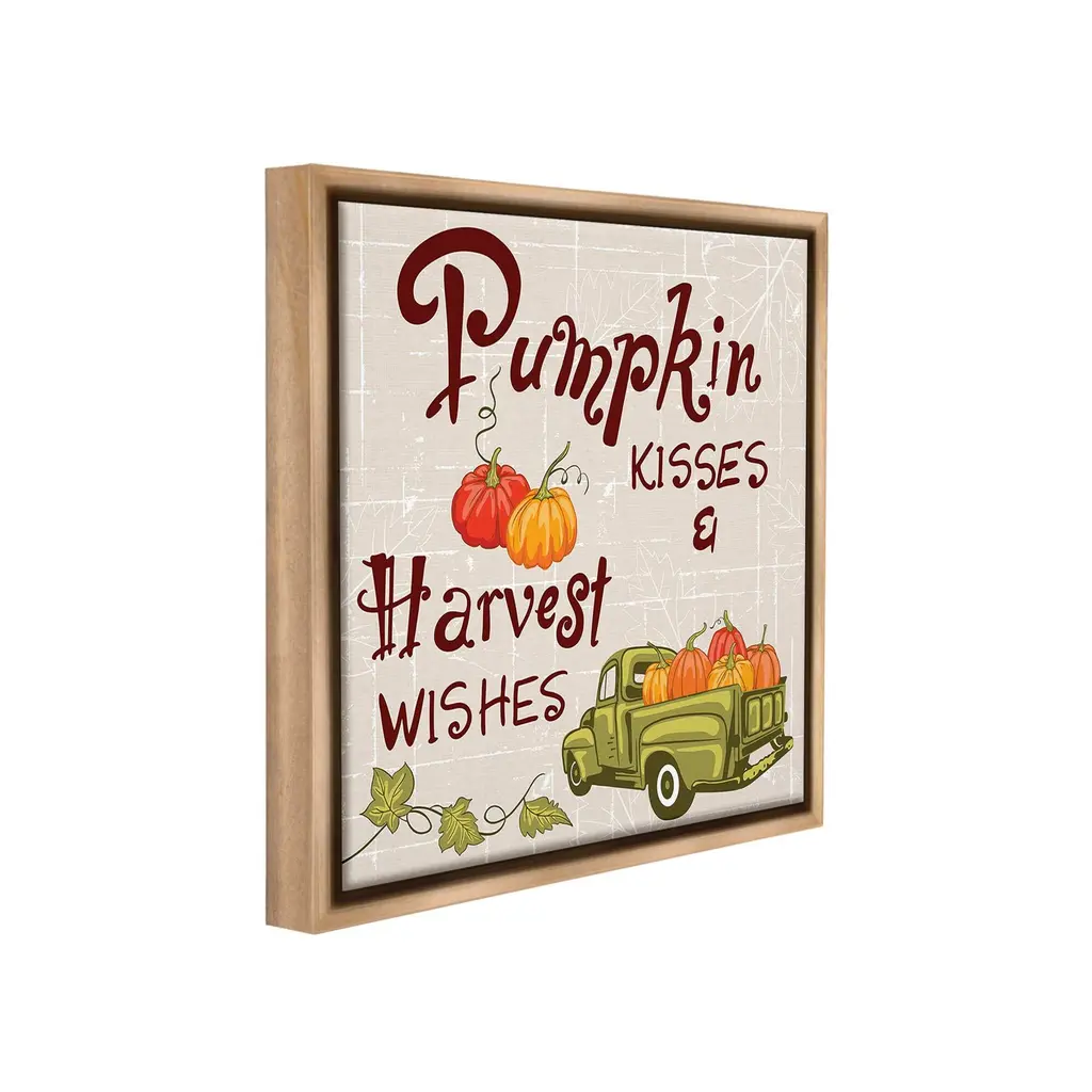 Elevate your home or office to the next level with Stupell Framed Floating Canvas Wall Art. Our premium hand-stretched canvas is mounted securely into a sturdy lightweight frame. The museum-style gap between the wrapped canvas and the box frame gives the illusion of floating artwork. Stupell Wall Art is made in the USA.Features: Dimensions: 18 x 1.7 x 18 Frame, 17 x 1.5 x 17 Canvas ArtFloating Frame Canvas Products are available in sizes 18"x18" and 25"x25". All Floating Frame Canvas Products have a 1.7" Depth.Wall Art is Ready to Hang with Hardware Free Hanging. No Installation required. For Easy Set Up Lean or Layer Artwork on Shelf or Against Wall. Artwork is Permently Fixed into the Frame.Our elevated 1.7" Thick Floating Frame is the perfect complement to our canvas style Wall Art. We use only the highest quality inks in house with industry leading printing solutions. Canvas is hand stretched over a durable wood foundation and then mounted securly into a Modern Box Frame. Made in the USA.Artwork Relates To: Nature, Country, Harvest, Plant, Fall, Autumn, Pumpkin, Phrase, Pattern, Farmhouse, Truck, Pumpkin Kisses & Harvest WishesDesign by Diane Labombarbe