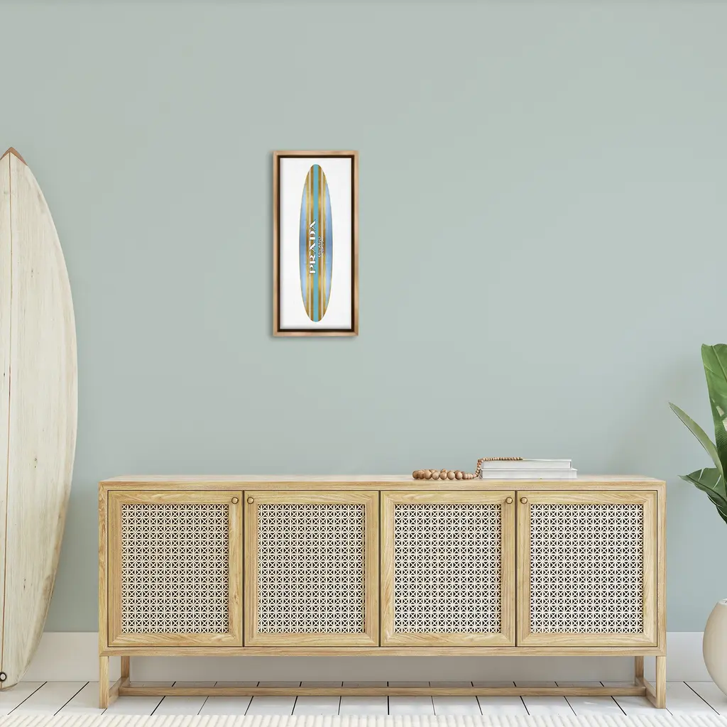 Elevate your home or office to the next level with Stupell Framed Floating Canvas Wall Art. Our premium hand-stretched canvas is mounted securely into a sturdy lightweight frame. The museum-style gap between the wrapped canvas and the box frame gives the illusion of floating artwork. Stupell Wall Art is made in the USA.Features: Dimensions: 11 x 1.7 x 25 Frame, 10 x 1.5 x 24 Canvas ArtFloating Frame Canvas Products are available in sizes 11"x25" and 14"x31". All Floating Frame Canvas Products have a 1.7" Depth.Wall Art is Ready to Hang with Hardware Free Hanging. No Installation required. For Easy Set Up Lean or Layer Artwork on Shelf or Against Wall. Artwork is Permently Fixed into the Frame.Our elevated 1.7" Thick Floating Frame is the perfect complement to our canvas style Wall Art. We use only the highest quality inks in house with industry leading printing solutions. Canvas is hand stretched over a durable wood foundation and then mounted securly into a Modern Box Frame. Made in the USA.Artwork Relates To: Nautical, Sport, Surfing, Surfboard, Glam, Fashion, Pattern, Logo, DesignerDesign by Madeline Blake