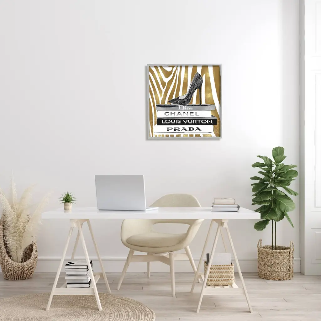Stupell Fashion High Heel Bookstack Glam Gold Zebra Print Framed Wall Art, 12 X 12 - Black - 24 X 24 - Wood - Grey