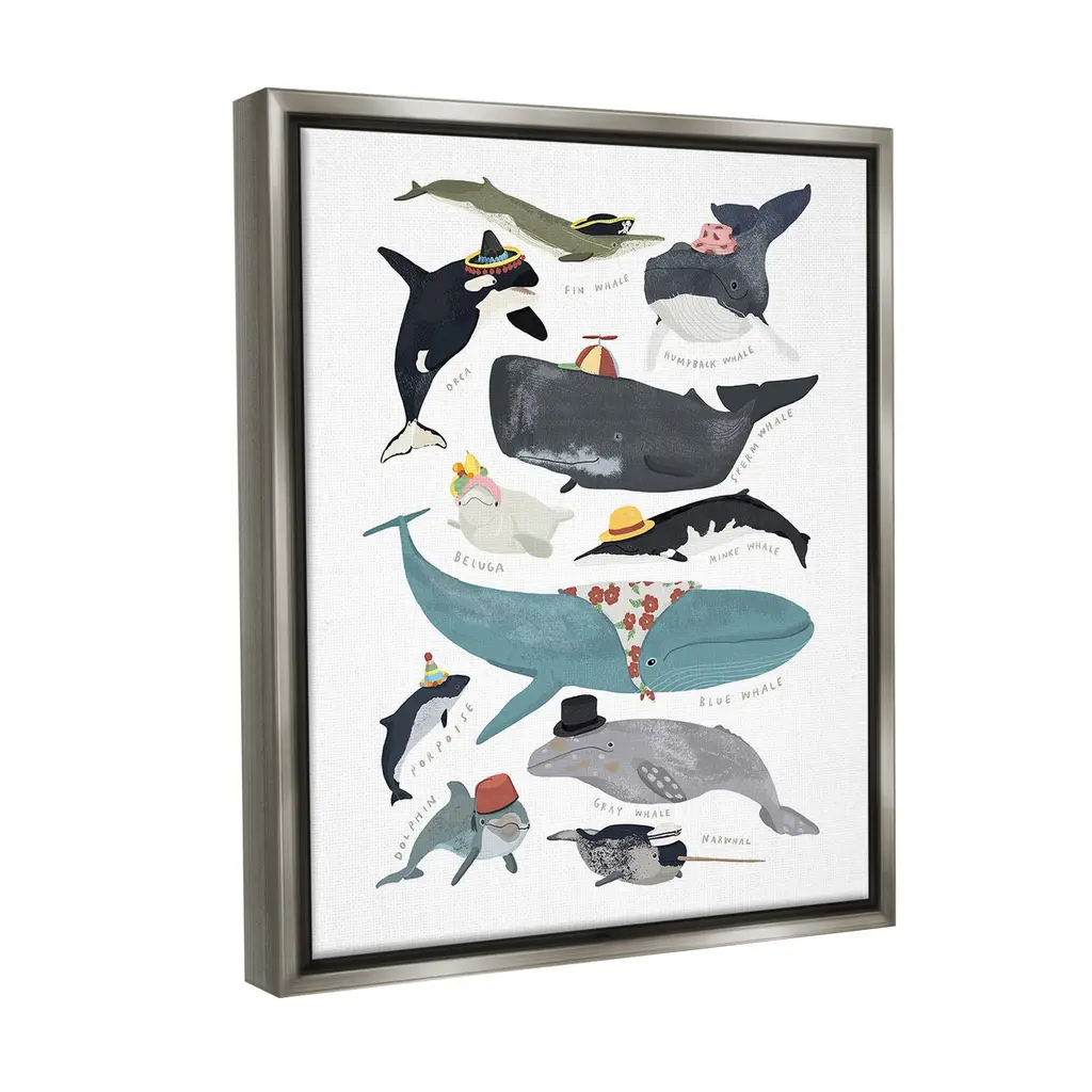 Elevate your home or office to the next level with Stupell Framed Floating Canvas Wall Art. Our premium hand-stretched canvas is mounted securely into a sturdy lightweight frame. The museum-style gap between the wrapped canvas and the box frame gives the illusion of floating artwork. Stupell Wall Art is made in the USA.Features: Dimensions: 17 x 1.7 x 21 Frame, 16 x 1.5 x 20 Canvas ArtFloating Frame Canvas Products are available in sizes 17"x21" and 25"x31". All Floating Frame Canvas Products have a 1.7" Depth.Wall Art is Ready to Hang with Hardware Free Hanging. No Installation required. For Easy Set Up Lean or Layer Artwork on Shelf or Against Wall. Artwork is Permently Fixed into the Frame.Our elevated 1.7" Thick Floating Frame is the perfect complement to our canvas style Wall Art. We use only the highest quality inks in house with industry leading printing solutions. Canvas is hand stretched over a durable wood foundation and then mounted securly into a Modern Box Frame. Made in the USA.Artwork Relates To: Animal, Mammal, Sea Life, Whale, Fish, Dolphin, Orca, Fashion, Floral, Educational, DiagramDesign by Hanna Melin