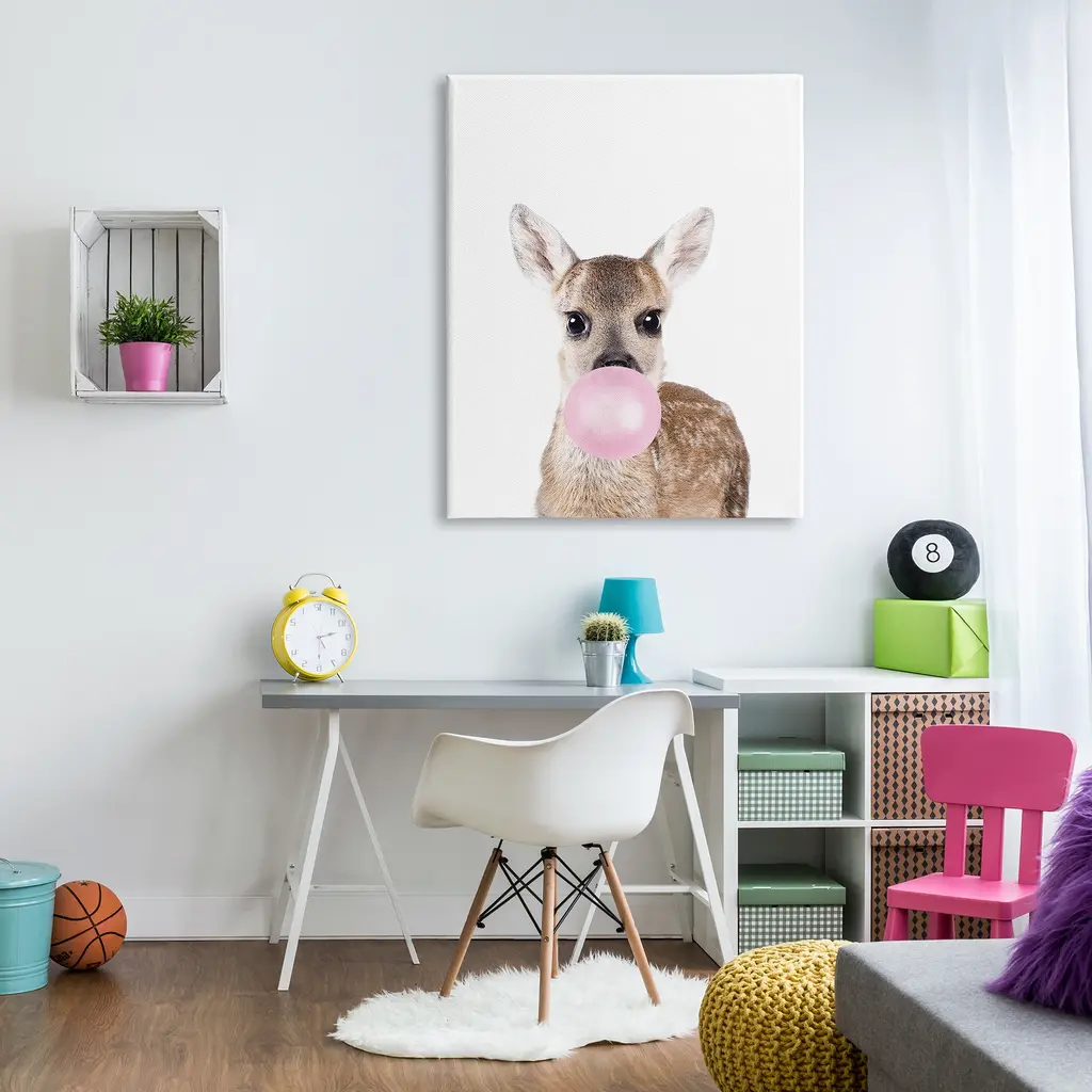 We create our stretched canvas to the highest standards. Using only the highest quality inks and canvas on Mimaki printers, we hand-cut and stretch each piece over a 1.5-inch thick wooden frame for hanging. As a result, the art comes ready to hang on the sturdy ledge with no installation required. Stupell Wall Art is made in the USA.Features: Dimensions: 16 x 1.5 x 20 InchesStretched Canvas Sizes Include Standard: 16 x 1.5 x 20 Large: 20 x 1.5 x 30 X-Large: 30 x 1.5 x 40 Oversized: 36 x 1.5 x 48Wall Art is Ready to Hang with Hardware Free Hanging. No installation required. For Easy Set Up Lean or Layer Artwork on Shelf or Against Wall.Our stretched canvas is created with the highest standards. We use only the highest quality inks and canvas on our in house Mimaki printers, and then hand cut and stretch each piece over a 1.5 inch thick wooden frame for hanging. Made In USA.Artwork Relates To: Animal, Mammal, Wildlife, Bubblegum, Deer, FawnDesign by Sisi and Seb