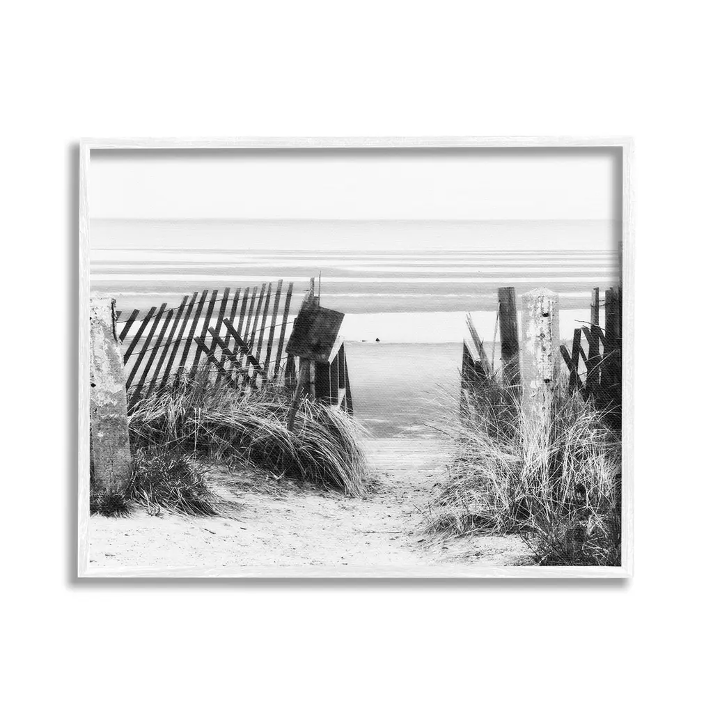 Add dimension to any room with our textured Framed Giclee Artwork. Our framed artwork is securely mounted into a 1.5-inch thick wood grain frame and ready to hang. Frames are available in three alluring styles: black, gray farmhouse and white. In addition, you should check out our oversized options if you want a statement piece. Stupell Wall Art is made in the USA.Features: Dimensions: 14 x 1.5 x 11 FramedFramed Giclee Products are available in the sizes 14"x11", 20"x16" or 30"x24". All Framed Giclee Products have a 1.5" Depth. Wall Art is Ready to Hang with Hardware Free Hanging. No installation required. For Easy Set Up Lean or Layer Artwork on Shelf or Against Wall.Our giclée prints are carefully mounted on a durable MDF backing, and then perfectly finished in a 1.5 inch thick woodgrain frame. Mounted frame colors include black, gray farmhouse and white. Made In USA.Artwork Relates To: Beach, Coast, Sea, Shoreline, Fence, Nautical, Shore, Monochrome, PhotographyDesign by GraffiTee Studios