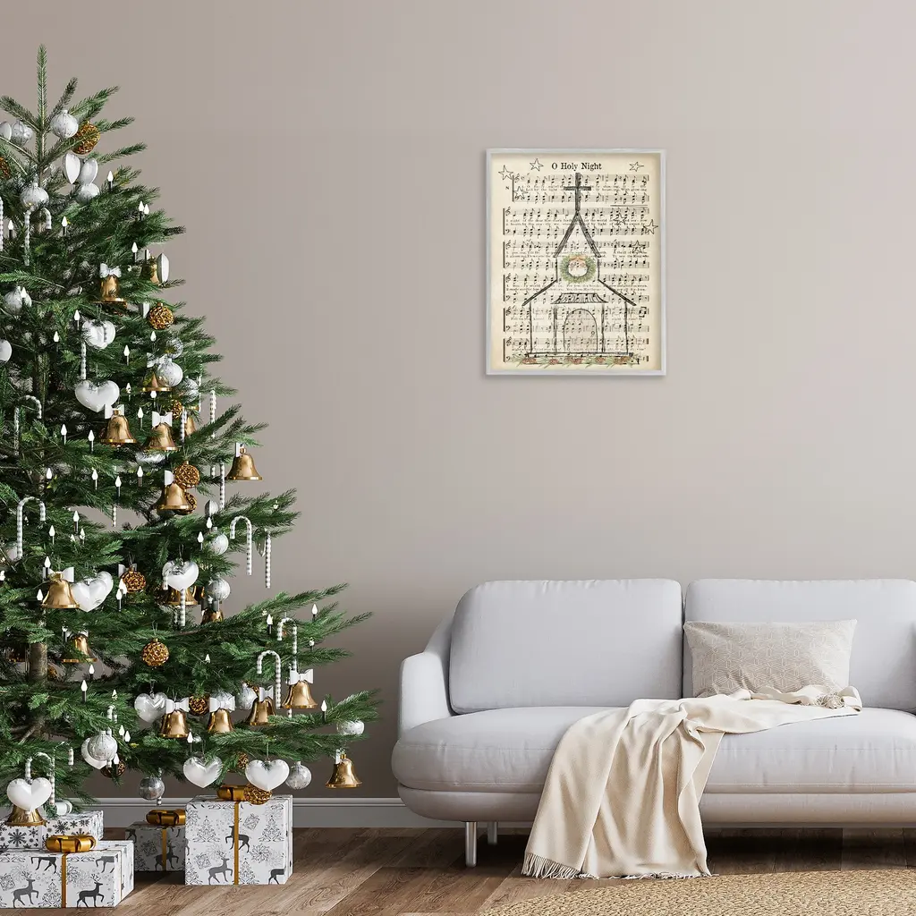 Stupell Festive Winter Church Holy Night Musical Script Framed Wall Art - Tan - 24 X 30 - Grey
