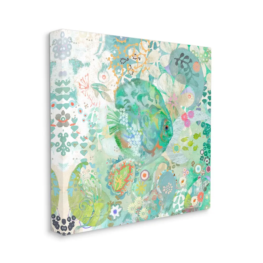 We create our stretched canvas to the highest standards. Using only the highest quality inks and canvas on Mimaki printers, we hand-cut and stretch each piece over a 1.5-inch thick wooden frame for hanging. As a result, the art comes ready to hang on the sturdy ledge with no installation required. Stupell Wall Art is made in the USA.Features: Dimensions: 17 x 1.5 x 17 InchesStretched Canvas Sizes Include Standard: 17 x 1.5 x 17 Large: 24 x 1.5 x 24 X-Large: 30 x 1.5 x 30 Oversized: 36 x 1.5 x 36Wall Art is Ready to Hang with Hardware Free Hanging. No installation required. For Easy Set Up Lean or Layer Artwork on Shelf or Against Wall.Our stretched canvas is created with the highest standards. We use only the highest quality inks and canvas on our in house Mimaki printers, and then hand cut and stretch each piece over a 1.5 inch thick wooden frame for hanging. Made In USA.Artwork Relates To: Pattern, Collage, Floral, Animal, Fish, Sea, ModernDesign by Evelia Designs