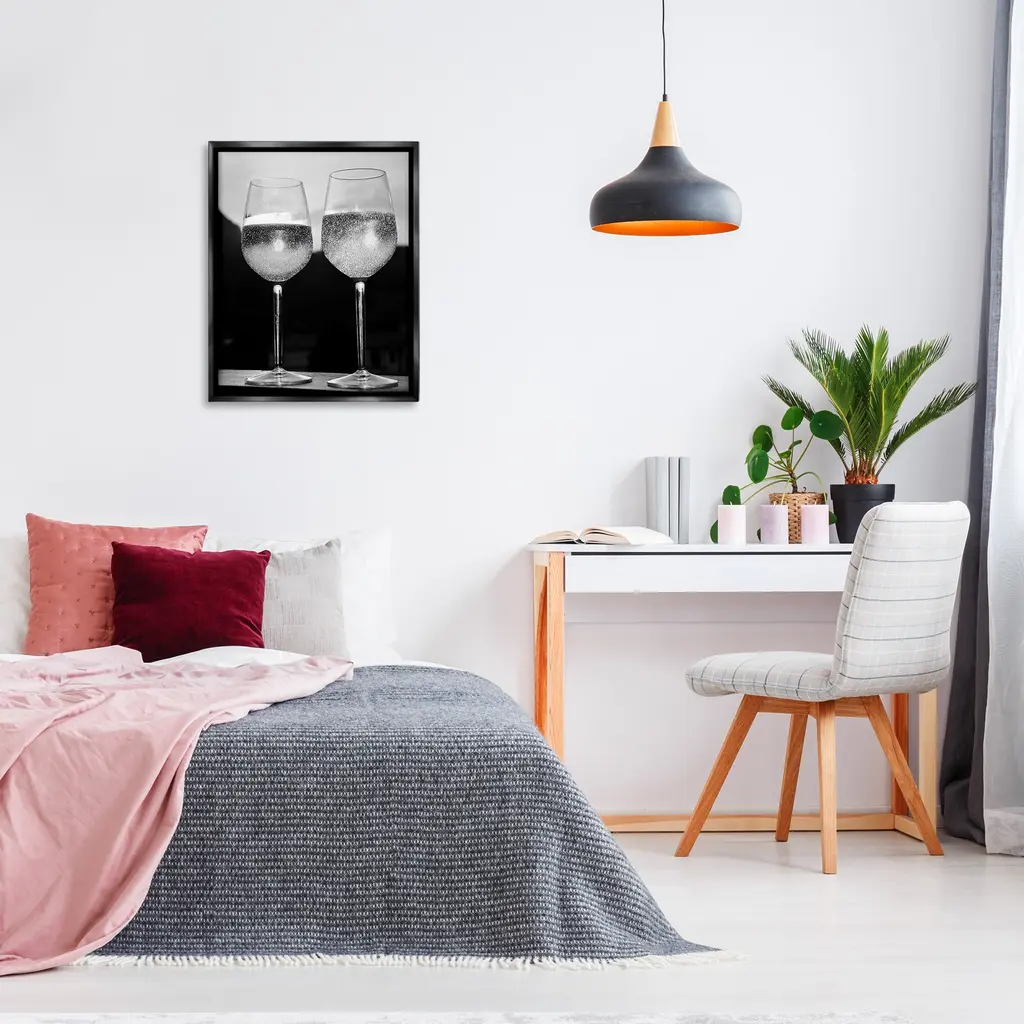 Elevate your home or office to the next level with Stupell Framed Floating Canvas Wall Art. Our premium hand-stretched canvas is mounted securely into a sturdy lightweight frame. The museum-style gap between the wrapped canvas and the box frame gives the illusion of floating artwork. Stupell Wall Art is made in the USA.Features: Dimensions: 17 x 1.7 x 21 Frame, 16 x 1.5 x 20 Canvas ArtFloating Frame Canvas Products are available in sizes 17"x21" and 25"x31". All Floating Frame Canvas Products have a 1.7" Depth.Wall Art is Ready to Hang with Hardware Free Hanging. No Installation required. For Easy Set Up Lean or Layer Artwork on Shelf or Against Wall. Artwork is Permently Fixed into the Frame.Our elevated 1.7" Thick Floating Frame is the perfect complement to our canvas style Wall Art. We use only the highest quality inks in house with industry leading printing solutions. Canvas is hand stretched over a durable wood foundation and then mounted securly into a Modern Box Frame. Made in the USA.Artwork Relates To: Glass, Alcohol, Beverage, Liquor, Wine, Wine Glass, Glam, MonochromeDesign by Lil' Rue
