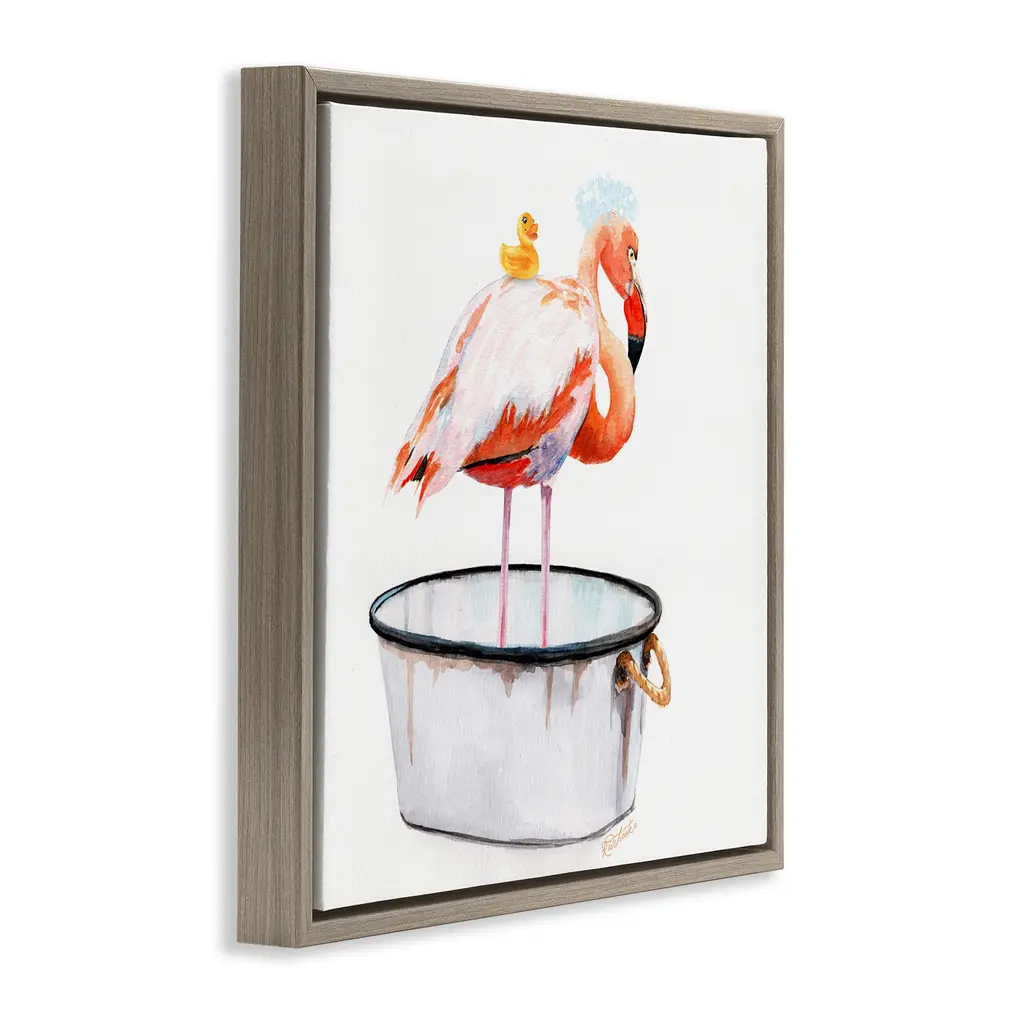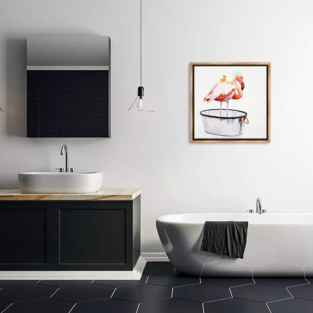 Elevate your home or office to the next level with Stupell Framed Floating Canvas Wall Art. Our premium hand-stretched canvas is mounted securely into a sturdy lightweight frame. The museum-style gap between the wrapped canvas and the box frame gives the illusion of floating artwork. Stupell Wall Art is made in the USA.Features: Dimensions: 18 x 1.7 x 18 Frame, 17 x 1.5 x 17 Canvas ArtFloating Frame Canvas Products are available in sizes 18"x18" and 25"x25". All Floating Frame Canvas Products have a 1.7" Depth.Wall Art is Ready to Hang with Hardware Free Hanging. No Installation required. For Easy Set Up Lean or Layer Artwork on Shelf or Against Wall. Artwork is Permently Fixed into the Frame.Our elevated 1.7" Thick Floating Frame is the perfect complement to our canvas style Wall Art. We use only the highest quality inks in house with industry leading printing solutions. Canvas is hand stretched over a durable wood foundation and then mounted securly into a Modern Box Frame. Made in the USA.Artwork Relates To: Bathroom, Bath, Tub, Animal, Flamingo, BubblesDesign by Jennifer Redstreake
