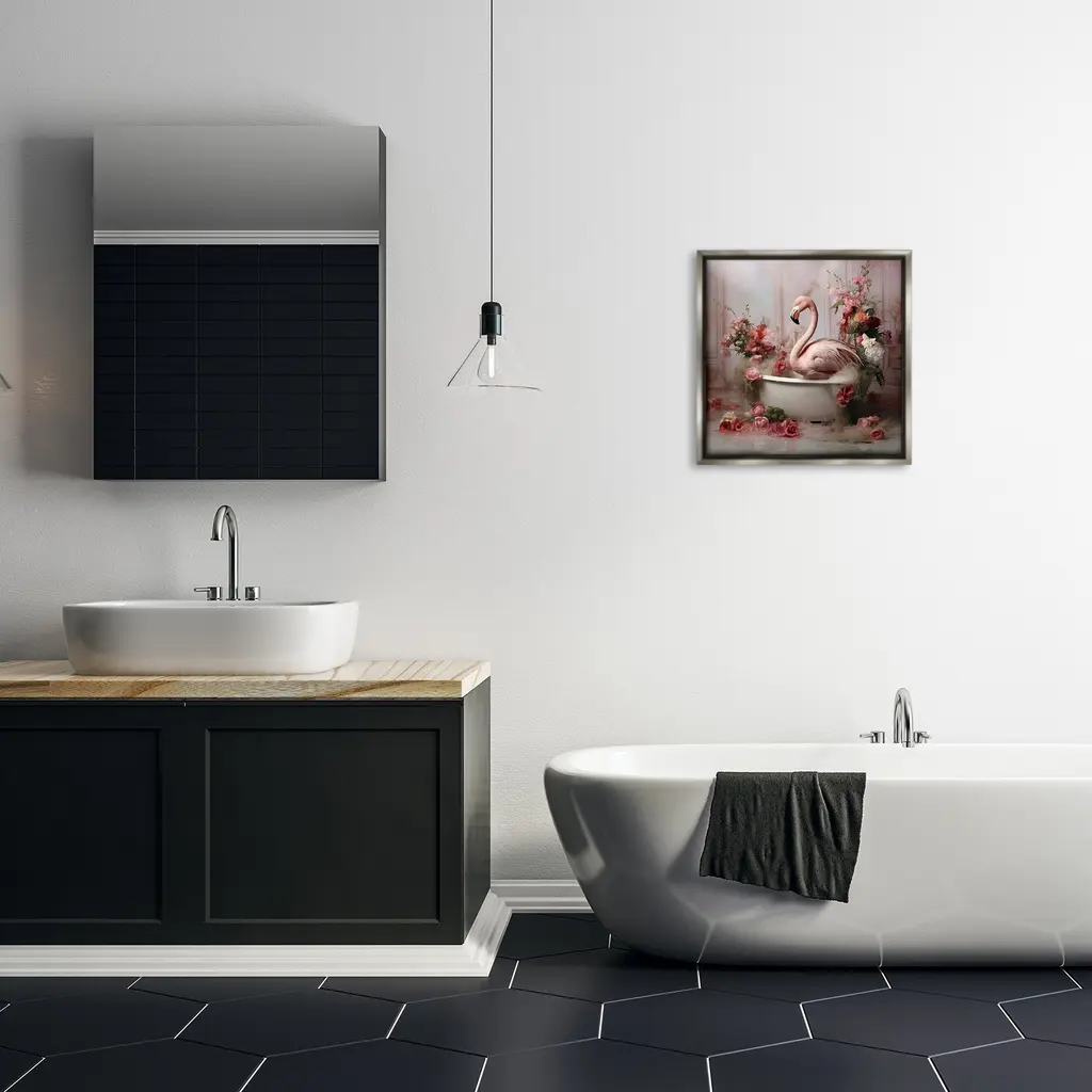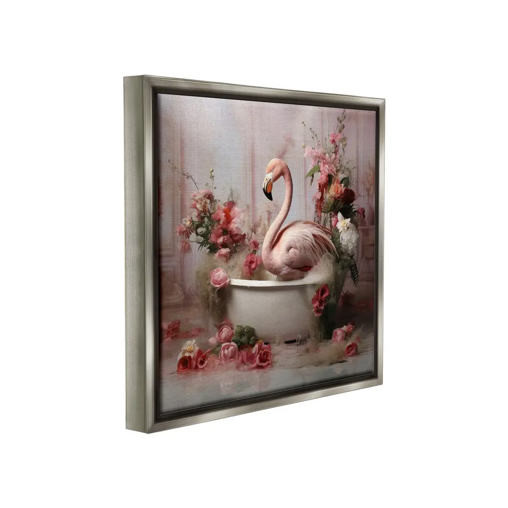 Elevate your home or office to the next level with Stupell Framed Floating Canvas Wall Art. Our premium hand-stretched canvas is mounted securely into a sturdy lightweight frame. The museum-style gap between the wrapped canvas and the box frame gives the illusion of floating artwork. Stupell Wall Art is made in the USA.Features: Dimensions: 18 x 1.7 x 18 Frame, 17 x 1.5 x 17 Canvas ArtFloating Frame Canvas Products are available in sizes 18"x18" and 25"x25". All Floating Frame Canvas Products have a 1.7" Depth.Wall Art is Ready to Hang with Hardware Free Hanging. No Installation required. For Easy Set Up Lean or Layer Artwork on Shelf or Against Wall. Artwork is Permently Fixed into the Frame.Our elevated 1.7" Thick Floating Frame is the perfect complement to our canvas style Wall Art. We use only the highest quality inks in house with industry leading printing solutions. Canvas is hand stretched over a durable wood foundation and then mounted securly into a Modern Box Frame. Made in the USA.Artwork Relates To: Bathroom, Animal, Mammal, Bathtub, Tub, Flower, Flamingo, BlossomDesign by Lazar Studio