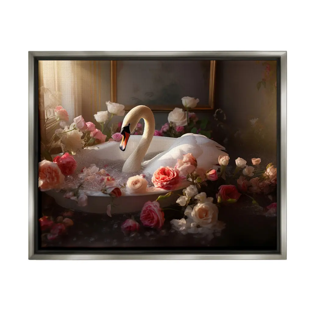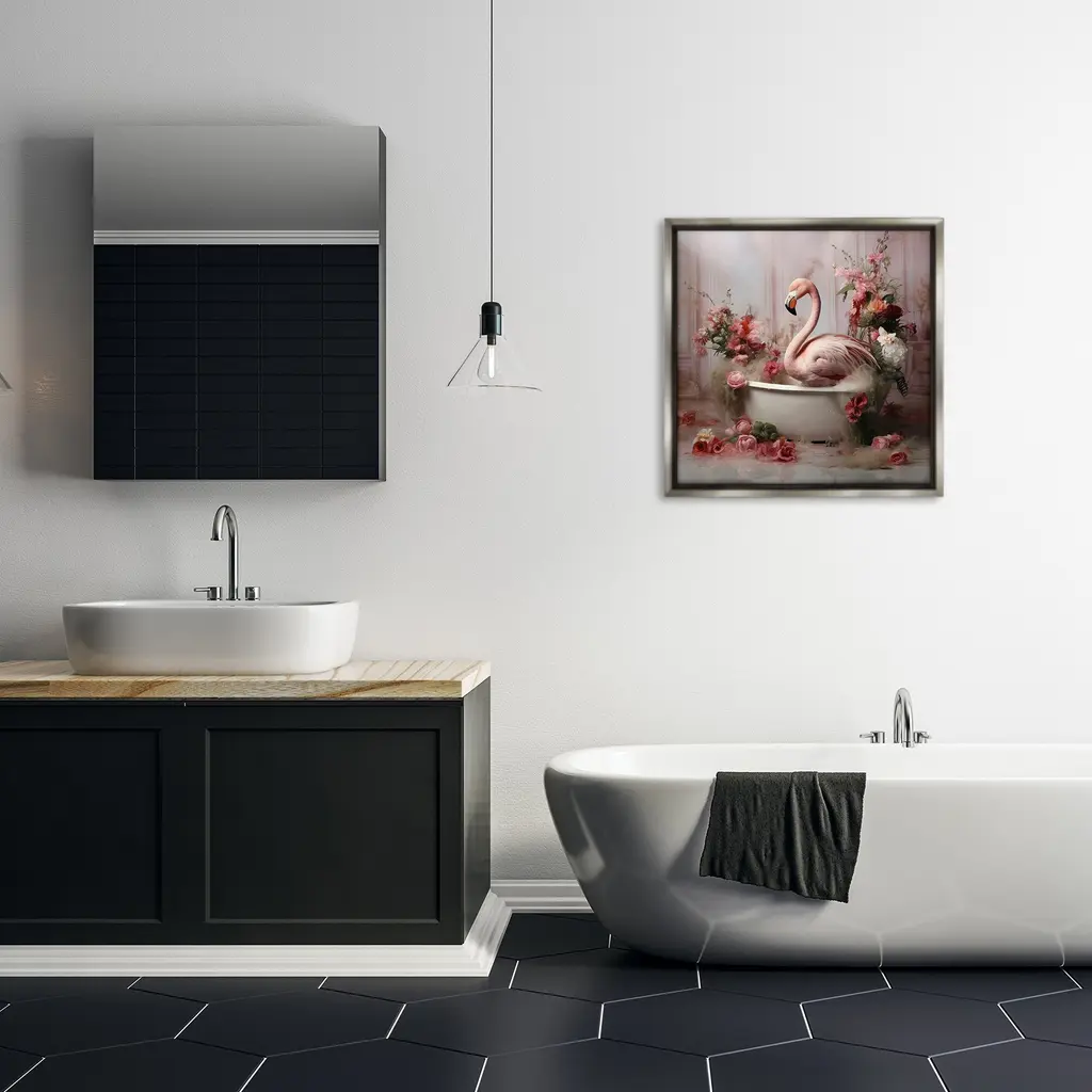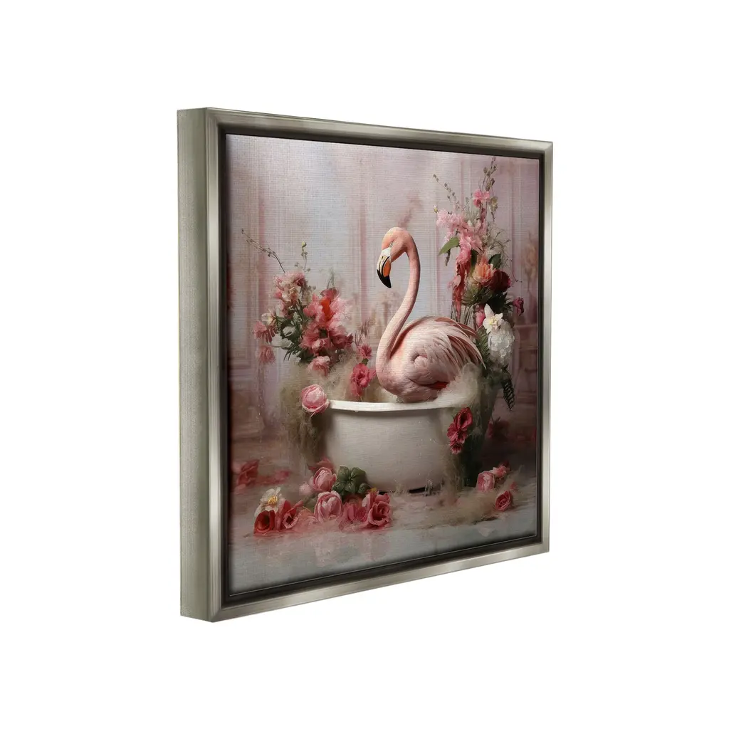 Elevate your home or office to the next level with Stupell Framed Floating Canvas Wall Art. Our premium hand-stretched canvas is mounted securely into a sturdy lightweight frame. The museum-style gap between the wrapped canvas and the box frame gives the illusion of floating artwork. Stupell Wall Art is made in the USA.Features: Dimensions: 18 x 1.7 x 18 Frame, 17 x 1.5 x 17 Canvas ArtFloating Frame Canvas Products are available in sizes 18"x18" and 25"x25". All Floating Frame Canvas Products have a 1.7" Depth.Wall Art is Ready to Hang with Hardware Free Hanging. No Installation required. For Easy Set Up Lean or Layer Artwork on Shelf or Against Wall. Artwork is Permently Fixed into the Frame.Our elevated 1.7" Thick Floating Frame is the perfect complement to our canvas style Wall Art. We use only the highest quality inks in house with industry leading printing solutions. Canvas is hand stretched over a durable wood foundation and then mounted securly into a Modern Box Frame. Made in the USA.Artwork Relates To: Bathroom, Animal, Mammal, Bathtub, Tub, Flower, Flamingo, BlossomDesign by Lazar Studio