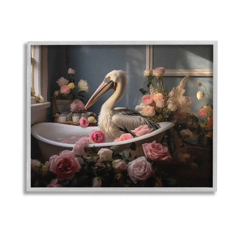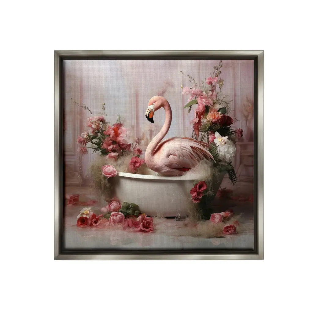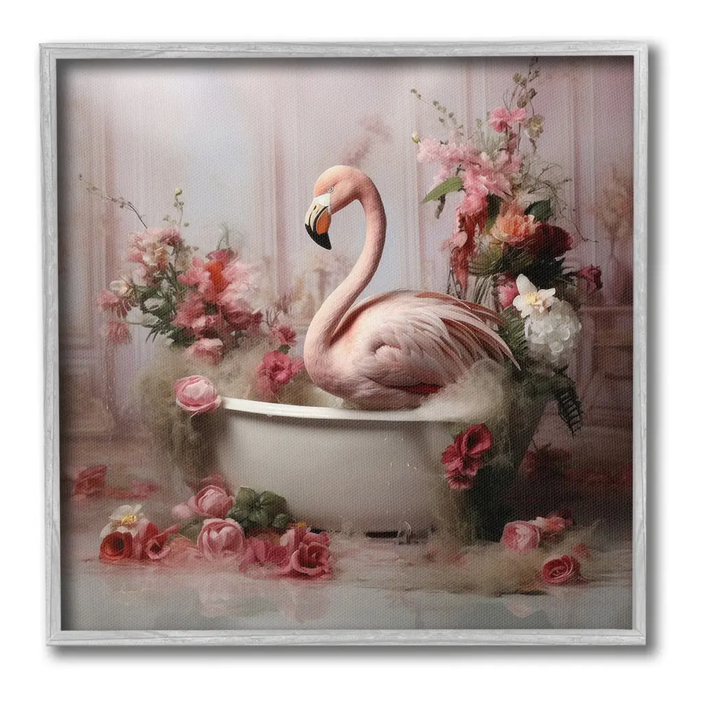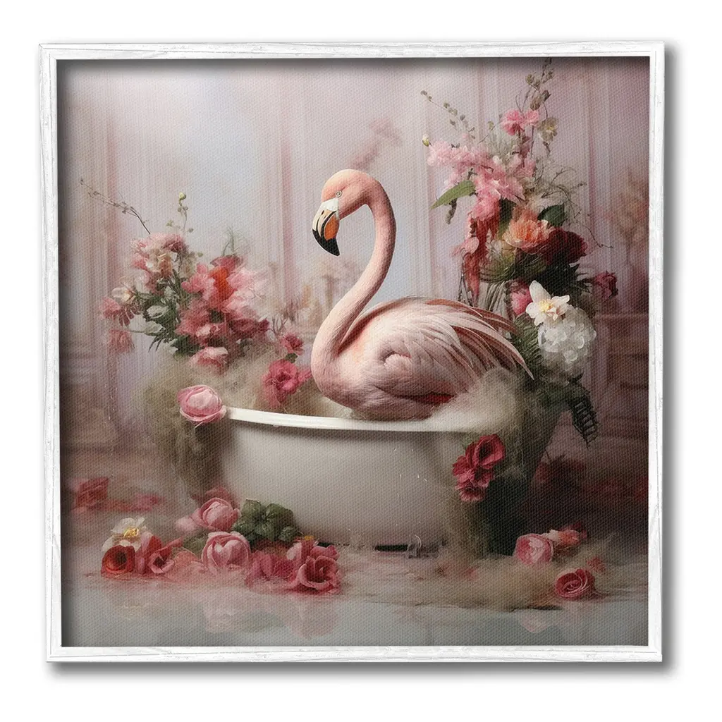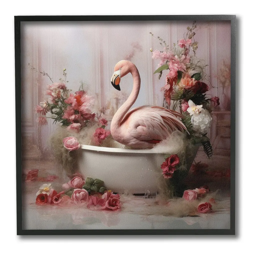 Add dimension to any room with our textured Framed Giclee Artwork. Our framed artwork is securely mounted into a 1.5-inch thick wood grain frame and ready to hang. Frames are available in three alluring styles: black, gray farmhouse and white. In addition, you should check out our oversized options if you want a statement piece. Stupell Wall Art is made in the USA.Features: Dimensions: 12 x 1.5 x 12 FramedFramed Giclee Product Sizes Include 12"x12", 17"x17", and 24"x24". Framed Giclee Products have a 1.5" Depth. Wall Art is Ready to Hang with Hardware Free Hanging. No installation required. For Easy Set Up Lean or Layer Artwork on Shelf or Against Wall.Our giclée prints are carefully mounted on a durable MDF backing, and then perfectly finished in a 1.5 inch thick woodgrain frame. Mounted frame colors include black, gray farmhouse and white. Made In USA.Artwork Relates To: Bathroom, Animal, Mammal, Bathtub, Tub, Flower, Flamingo, BlossomDesign by Lazar Studio