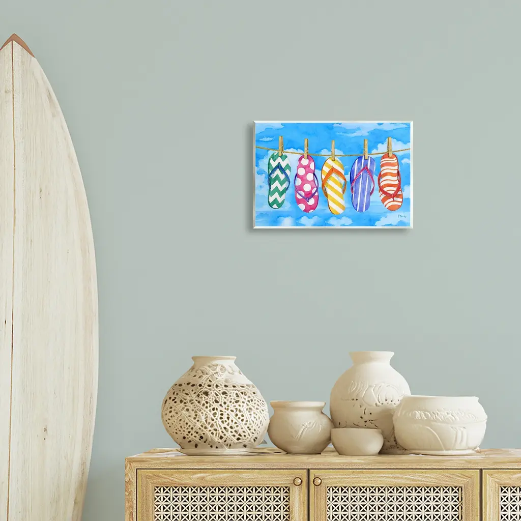 Our wall plaques start as high-quality lithograph prints mounted on durable 0.5-inch thick MDF wood. Each piece is hand finished and comes with a fresh layer of white foil on the sides to give it a crisp, clean look. Plaques arrive ready to hang without installation and come with removable plastic corners to keep them from damage in transit. Stupell Wall Art is made in the USA.Features: Dimensions: 15 x 0.5 x 10 InchesWall Plaque Product Sizes Include 15"x10" and 19"x13". All wall plaque products have a 0.5" Depth. Wall Art is Ready to Hang with Hardware Free Hanging. No installation required. For Easy Set Up Lean or Layer Artwork on Shelf or Against Wall.All of our wall plaques start off as high quality lithograph prints that are then mounted on durable 0.5 inch thick MDF wood. Each piece is hand finished and comes with a fresh layer of foil on the sides to give it a crisp clean look. Made In USA.Artwork Relates To: Flip-Flop, Sandal, Beach, Summer, Fun, Sky, CloudsDesign by Paul Brent