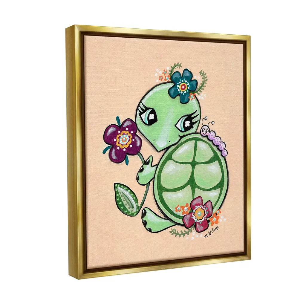 Stupell Floral Blossom Turtle Framed Floater Canvas Wall Art Design By Michelle Gilsey - 17 X 21 - Gold