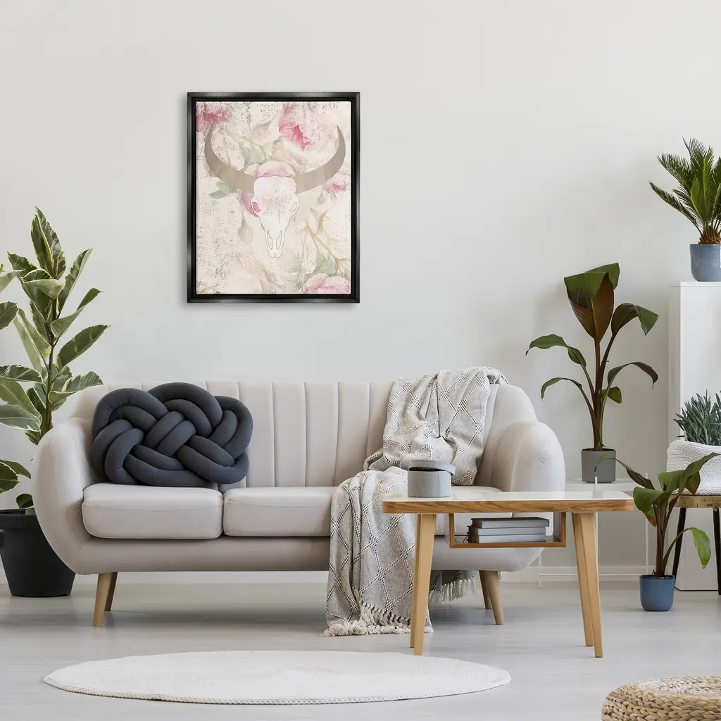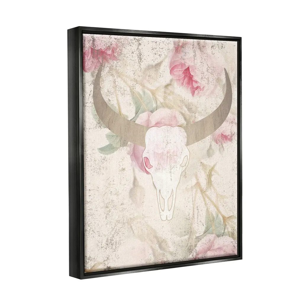 Elevate your home or office to the next level with Stupell Framed Floating Canvas Wall Art. Our premium hand-stretched canvas is mounted securely into a sturdy lightweight frame. The museum-style gap between the wrapped canvas and the box frame gives the illusion of floating artwork. Stupell Wall Art is made in the USA.Features: Dimensions: 17 x 1.7 x 21 Frame, 16 x 1.5 x 20 Canvas ArtFloating Frame Sizes Include Standard: 17 x 1.7 x 21 Oversized: 25 x 1.7 x 31Wall Art is Ready to Hang - No Installation or Hardware Needed. For Easy Set Up Lean or Layer Artwork on Shelf or Against Wall.Our elevated 1.7" Thick Floating Frame is the perfect complement to our canvas style Wall Art. We use only the highest quality inks in house with industry leading printing solutions. Canvas is hand stretched over a durable wood foundation and then mounted securly into a Modern Box Frame. Made in the USA.Artwork Relates To: Cattle Skull, Skull, Animal, Flower, Floral, RoseDesign by Lil' Rue