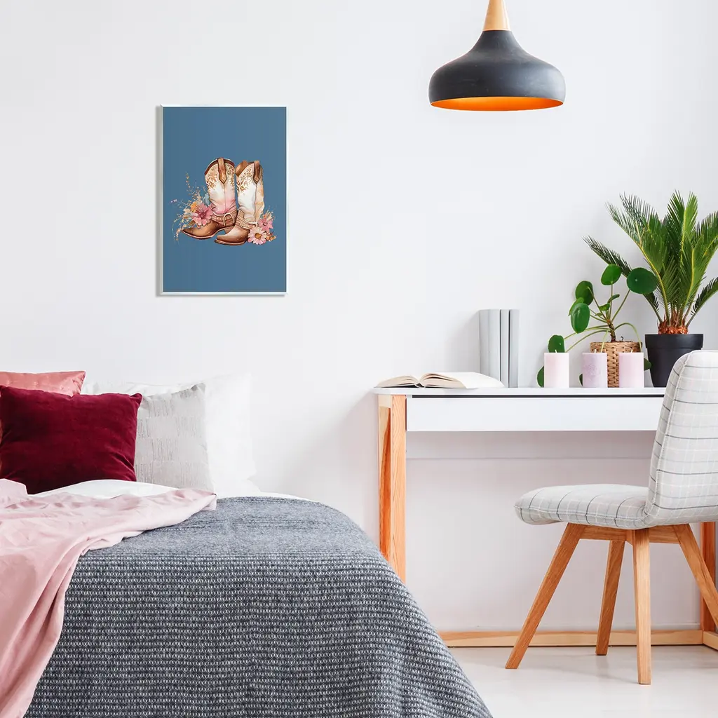 Our wall plaques start as high-quality lithograph prints mounted on durable 0.5-inch thick MDF wood. Each piece is hand finished and comes with a fresh layer of white foil on the sides to give it a crisp, clean look. Plaques arrive ready to hang without installation and come with removable plastic corners to keep them from damage in transit. Wall Art is made in the USA.Features: Dimensions: 10 x 0.5 x 15 InchesWall Plaque Sizes Include Standard: 10 x 0.5 x 15 Oversized: 13 x 0.5 x 19Wall Art is Ready to Hang with Hardware Free Hanging. No installation required. For Easy Set Up Lean or Layer Artwork on Shelf or Against Wall.All of our wall plaques start off as high quality lithograph prints that are then mounted on durable 0.5 inch thick MDF wood. Each piece is hand finished and comes with a fresh layer of foil on the sides to give it a crisp clean look. Made In USA.Artwork Relates To: Cowboy Boot, Cowboy Hat, Cowgirl, Glam, Flower, FloralDesign by Birch&Ink