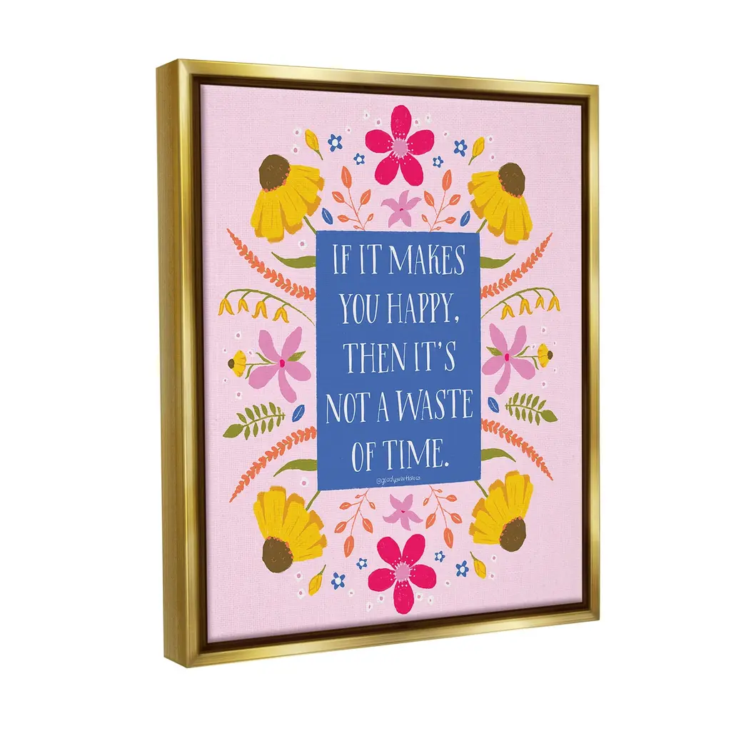 Elevate your home or office to the next level with Stupell Framed Floating Canvas Wall Art. Our premium hand-stretched canvas is mounted securely into a sturdy lightweight frame. The museum-style gap between the wrapped canvas and the box frame gives the illusion of floating artwork. Stupell Wall Art is made in the USA.Features: Dimensions: 17 x 1.7 x 21 Frame, 16 x 1.5 x 20 Canvas ArtFloating Frame Canvas Products are available in sizes 17"x21" and 25"x31". All Floating Frame Canvas Products have a 1.7" Depth.Wall Art is Ready to Hang with Hardware Free Hanging. No Installation required. For Easy Set Up Lean or Layer Artwork on Shelf or Against Wall. Artwork is Permently Fixed into the Frame.Our elevated 1.7" Thick Floating Frame is the perfect complement to our canvas style Wall Art. We use only the highest quality inks in house with industry leading printing solutions. Canvas is hand stretched over a durable wood foundation and then mounted securly into a Modern Box Frame. Made in the USA.Artwork Relates To: Floral, Flower, Pattern, Botanical, Plant, Inspirational, If It Makes You Happy Then It's Not a Waste of TimeDesign by Glad You're Here Co.