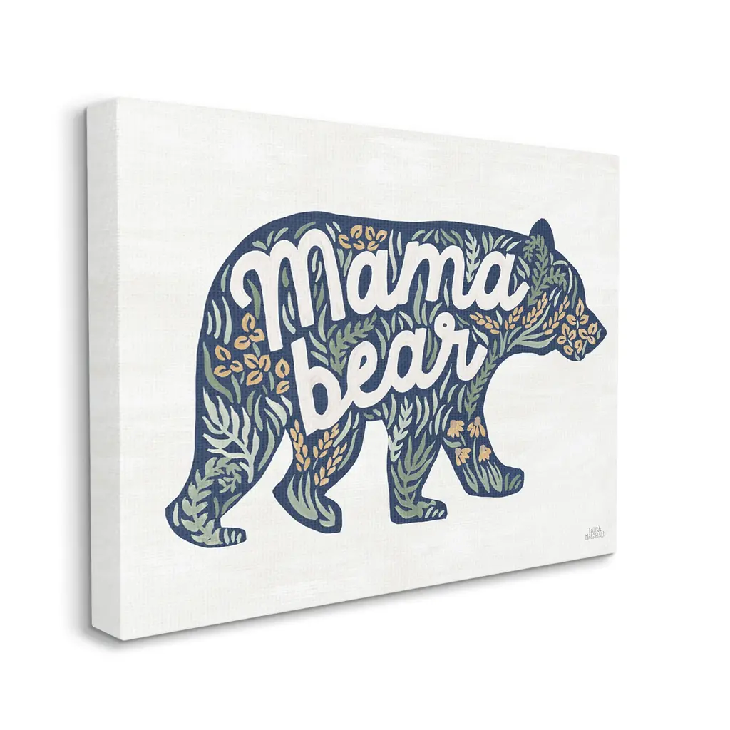 We create our stretched canvas to the highest standards. Using only the highest quality inks and canvas on Mimaki printers, we hand-cut and stretch each piece over a 1.5-inch thick wooden frame for hanging. As a result, the art comes ready to hang on the sturdy ledge with no installation required. Stupell Wall Art is made in the USA.Features: Dimensions: 20 x 1.5 x 16 InchesStretched Canvas Sizes Include Standard: 20 x 1.5 x 16 Large: 30 x 1.5 x 20 X-Large: 40 x 1.5 x 30 Oversized: 48 x 1.5 x 36Wall Art is Ready to Hang with Hardware Free Hanging. No installation required. For Easy Set Up Lean or Layer Artwork on Shelf or Against Wall.Our stretched canvas is created with the highest standards. We use only the highest quality inks and canvas on our in house Mimaki printers, and then hand cut and stretch each piece over a 1.5 inch thick wooden frame for hanging. Made In USA.Artwork Relates To: Animal, Bear, Mammal, Wildlife, Floral, Pattern, Mama BearDesign by Laura Marshall