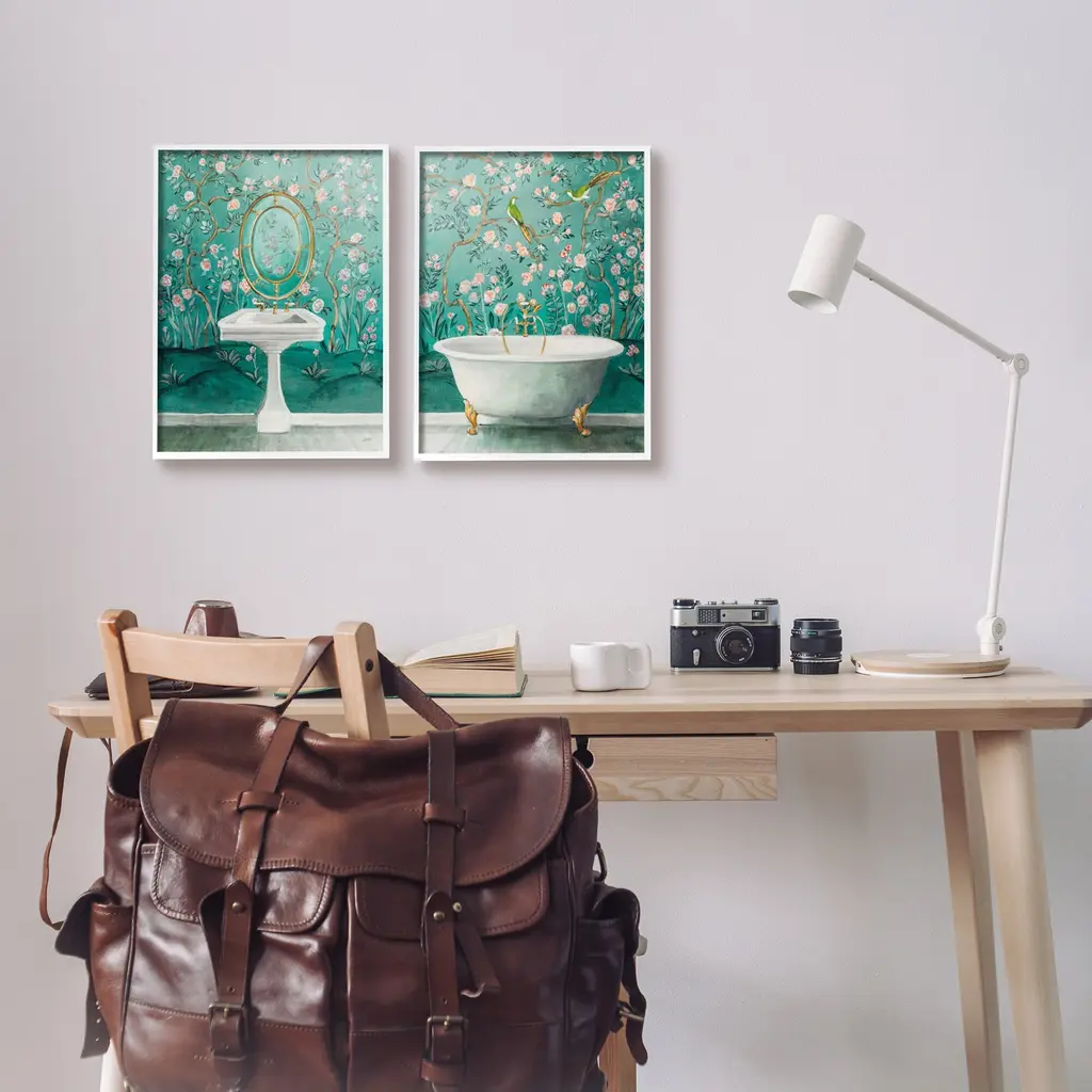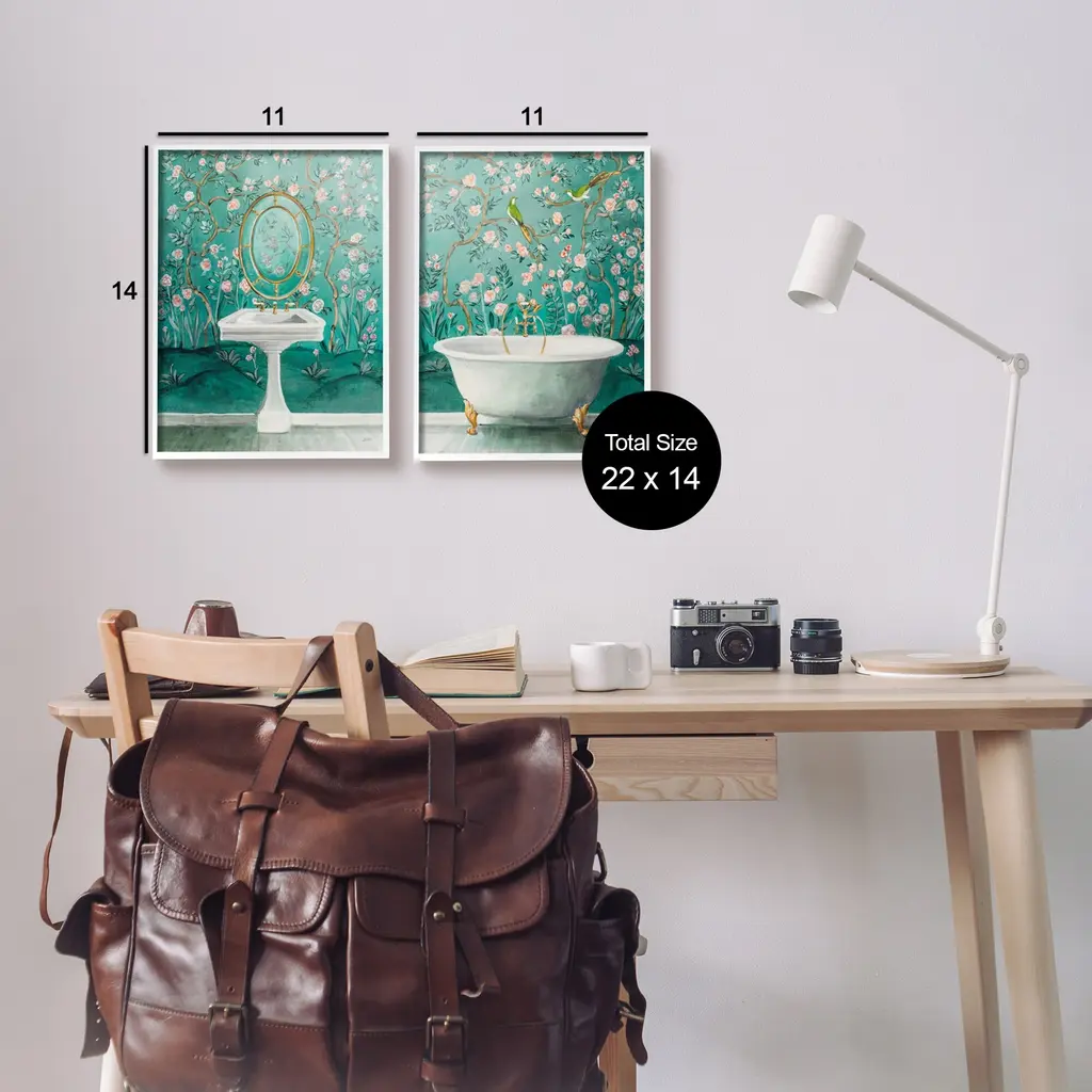 Fill any space in your home or office with our Framed Wall Art Sets. Our framed artwork is securely mounted into a 1.5-inch thick wood grain frame and ready to hang. Frames are available in three alluring styles: black, gray farmhouse and white. Stupell Wall Art is made in the USA.Features: Dimensions: 2 Piece Set, Each Panel is 11 x 1.5 x 14 FramedFramed Giclee Set Sizes Include Standard: 2pc, Each is 11 x 1.5 x 14 Large: 2pc, Each is 16 x 1.5 x 20 Oversized: 2pc, Each is 24 x 1.5 x 30Wall Art is Ready to Hang with Hardware Free Hanging. No installation required. For Easy Set Up Lean or Layer Artwork on Shelf or Against Wall.Curated Wall Art Sets make it easy for you complete the theme for any room. Our giclée prints are carefully mounted on a durable MDF backing, and then perfectly finished in a 1.5 inch thick woodgrain frame. Mounted frame colors include black, gray farmhouse and white. Made In USA.Artwork Relates To: Bathing, Bathtub, Tub, Sink, Sink Faucet, Painting, Bathroom, Turquoise, BirdDesign by Julia Purinton