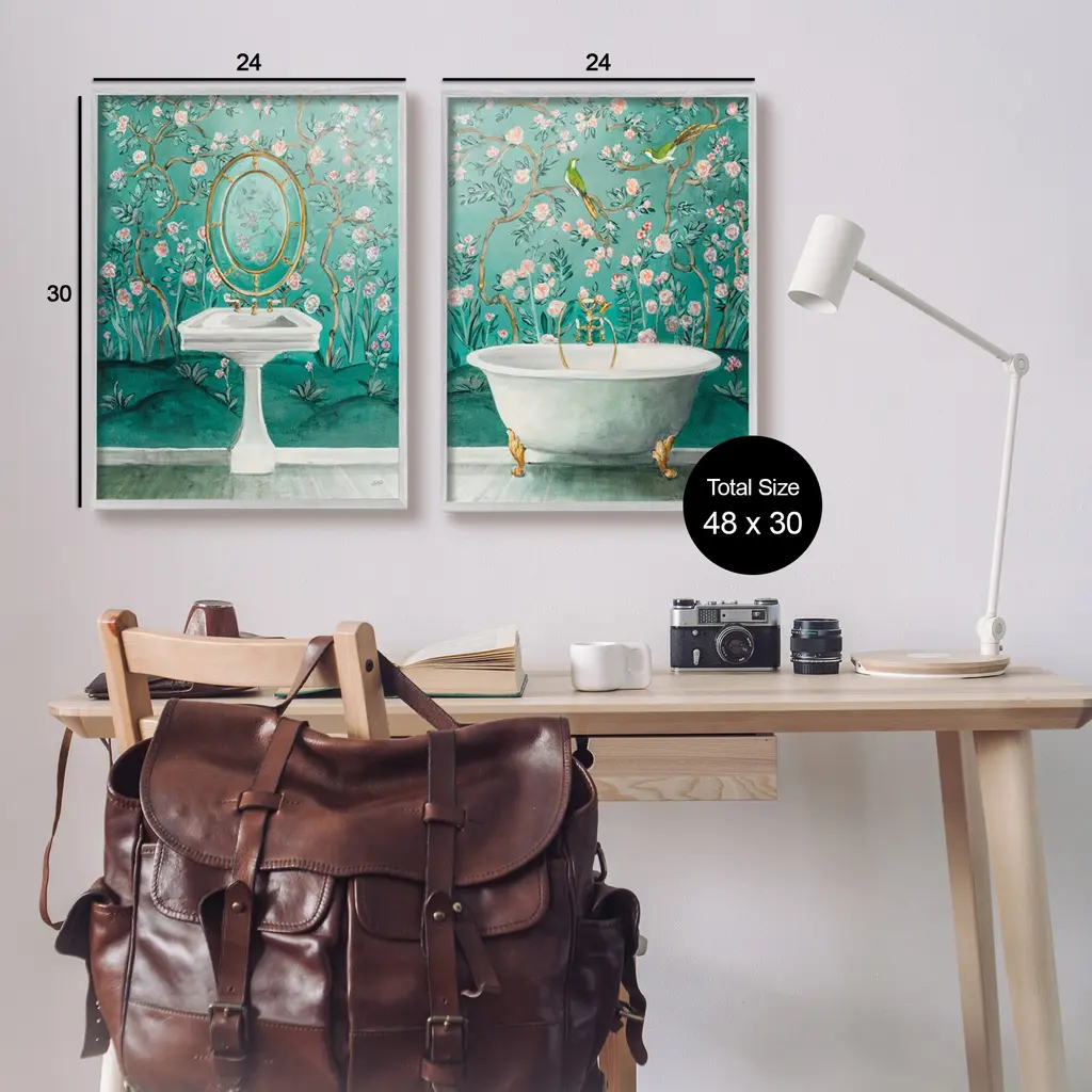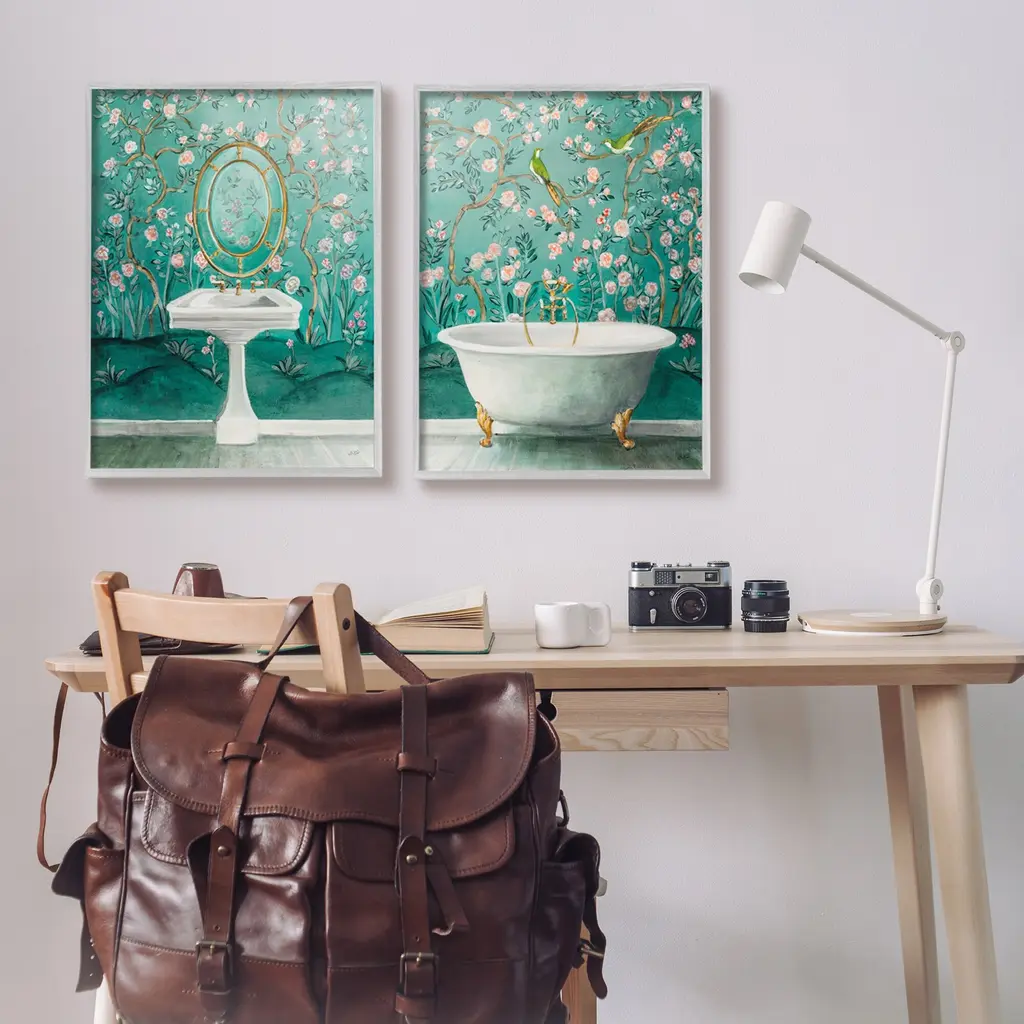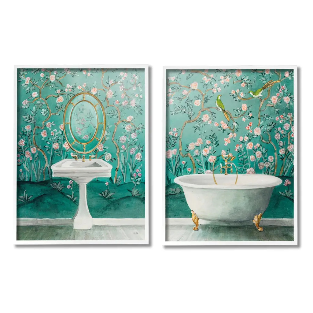 Fill any space in your home or office with our Framed Wall Art Sets. Our framed artwork is securely mounted into a 1.5-inch thick wood grain frame and ready to hang. Frames are available in three alluring styles: black, gray farmhouse and white. Stupell Wall Art is made in the USA.Features: Dimensions: 2 Piece Set, Each Panel is 11 x 1.5 x 14 FramedFramed Giclee Set Sizes Include Standard: 2pc, Each is 11 x 1.5 x 14 Large: 2pc, Each is 16 x 1.5 x 20 Oversized: 2pc, Each is 24 x 1.5 x 30Wall Art is Ready to Hang with Hardware Free Hanging. No installation required. For Easy Set Up Lean or Layer Artwork on Shelf or Against Wall.Curated Wall Art Sets make it easy for you complete the theme for any room. Our giclée prints are carefully mounted on a durable MDF backing, and then perfectly finished in a 1.5 inch thick woodgrain frame. Mounted frame colors include black, gray farmhouse and white. Made In USA.Artwork Relates To: Bathing, Bathtub, Tub, Sink, Sink Faucet, Painting, Bathroom, Turquoise, BirdDesign by Julia Purinton