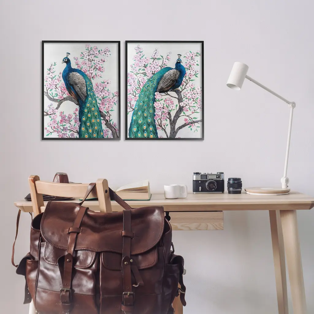 Fill any space in your home or office with our Framed Wall Art Sets. Our framed artwork is securely mounted into a 1.5-inch thick wood grain frame and ready to hang. Frames are available in three alluring styles: black, gray farmhouse and white. Stupell Wall Art is made in the USA.Features: Dimensions: 2 Piece Set, Each Panel is 11 x 1.5 x 14 FramedTwo Piece Framed Giclee Sets are available as 11"x14", 16"x20" or 24"x30" Panels. All Framed Giclee Products have a 1.5" Depth.Wall Art is Ready to Hang with Hardware Free Hanging. No installation required. For Easy Set Up Lean or Layer Artwork on Shelf or Against Wall.Curated Wall Art Sets make it easy for you complete the theme for any room. Our giclée prints are carefully mounted on a durable MDF backing, and then perfectly finished in a 1.5 inch thick woodgrain frame. Mounted frame colors include black, gray farmhouse and white. Made In USA.Artwork Relates To: Animal, Bird, Peacock, Flower, Plant, Beak, Botanical, Cherry Blossom, Pattern, Floral, NatureDesign by Tim OToole