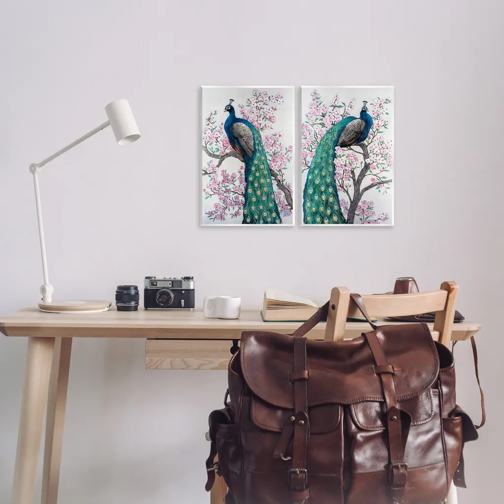 Fill any space with Stupell Wall Art Sets. Our wall plaques start as high-quality lithograph prints mounted on durable 0.5-inch thick MDF wood. Each piece is hand finished and comes with a fresh layer of white foil on the sides to give it a crisp, clean look. Plaques arrive ready to hang without installation and come with removable plastic corners to keep them from damage in transit. Stupell Wall Art is made in the USA.Features: Dimensions: 2 Piece Set, Each Panel is 10 x 0.5 x 15 InchesTwo Piece Wall Plaque Sets are available as 10"x15" or 13"x19" Panels. All Wall Art Plaques have a 0.5" Depth.Wall Art is Ready to Hang with Hardware Free Hanging. No installation required. For Easy Set Up Lean or Layer Artwork on Shelf or Against Wall.All of our wall plaques start off as high quality lithograph prints that are then mounted on durable 0.5 inch thick MDF wood. Each piece is hand finished and comes with a fresh layer of foil on the sides to give it a crisp clean look. Made In USA.Artwork Relates To: Animal, Bird, Peacock, Flower, Plant, Beak, Botanical, Cherry Blossom, Pattern, Floral, NatureDesign by Tim OToole