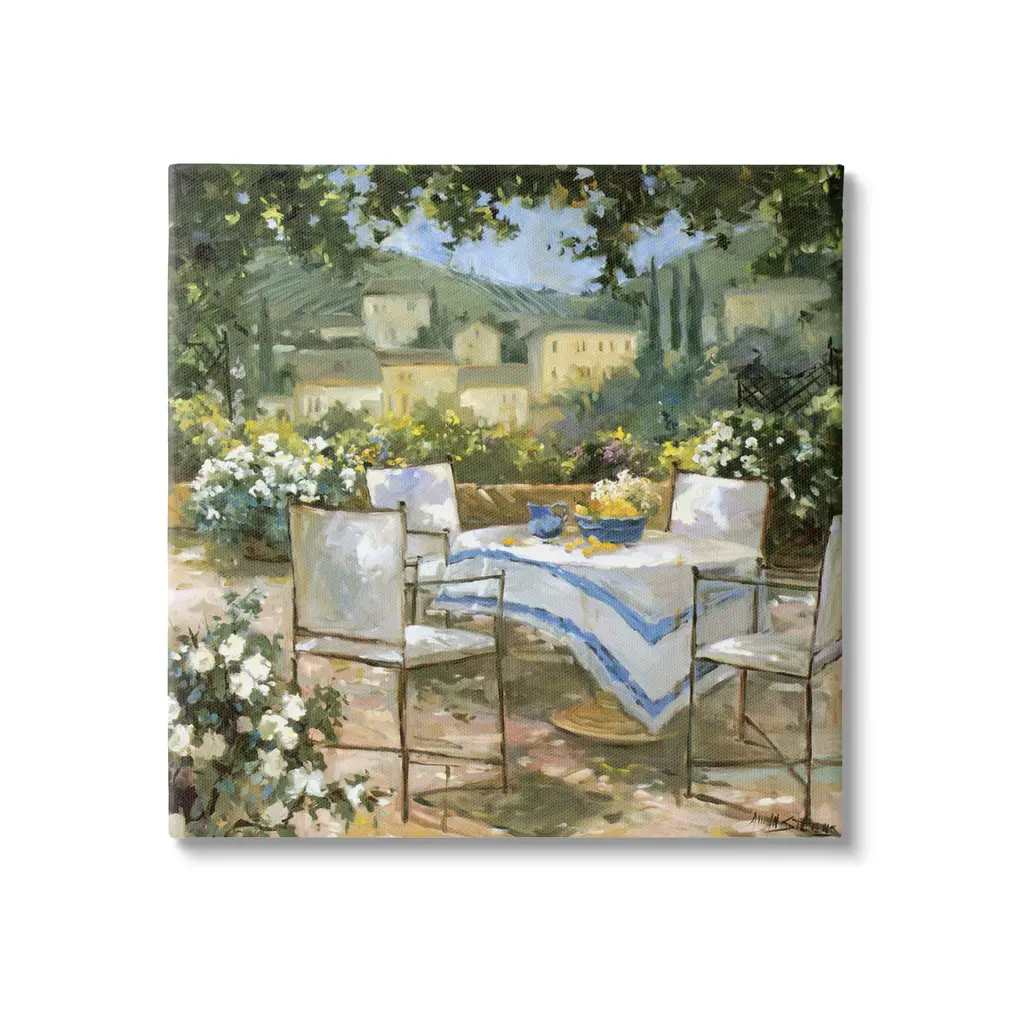 We create our stretched canvas to the highest standards. Using only the highest quality inks and canvas on Mimaki printers, we hand-cut and stretch each piece over a 1.5-inch thick wooden frame for hanging. As a result, the art comes ready to hang on the sturdy ledge with no installation required. Stupell Wall Art is made in the USA.Features: Dimensions: 17 x 1.5 x 17 InchesStretched Canvas Sizes Include Standard: 17 x 1.5 x 17 Large: 24 x 1.5 x 24 X-Large: 30 x 1.5 x 30 Oversized: 36 x 1.5 x 36Wall Art is Ready to Hang - No Installation or Hardware Needed. For Easy Set Up Lean or Layer Artwork on Shelf or Against Wall.Our stretched canvas is created with the highest standards. We use only the highest quality inks and canvas on our in house Mimaki printers, and then hand cut and stretch each piece over a 1.5 inch thick wooden frame for hanging. Made In USA.Artwork Relates To: Painting, Chair, Plant, Architecture, Cottage, Table, Terrace, Nature, Patio, FlowerDesign by Allayn Stevens