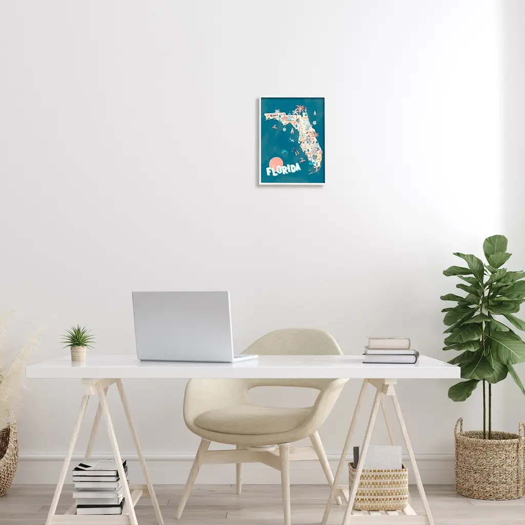 Stupell Florida Sunny State Retro Vacation Tourism Vivid Map Framed Wall Art, Design By Ziwei Li - Blue - 11 X 14 - White