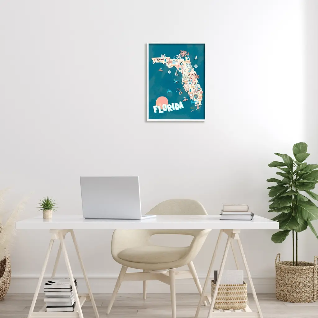 Stupell Florida Sunny State Retro Vacation Tourism Vivid Map Framed Wall Art, Design By Ziwei Li - Blue - 16 X 20 - White