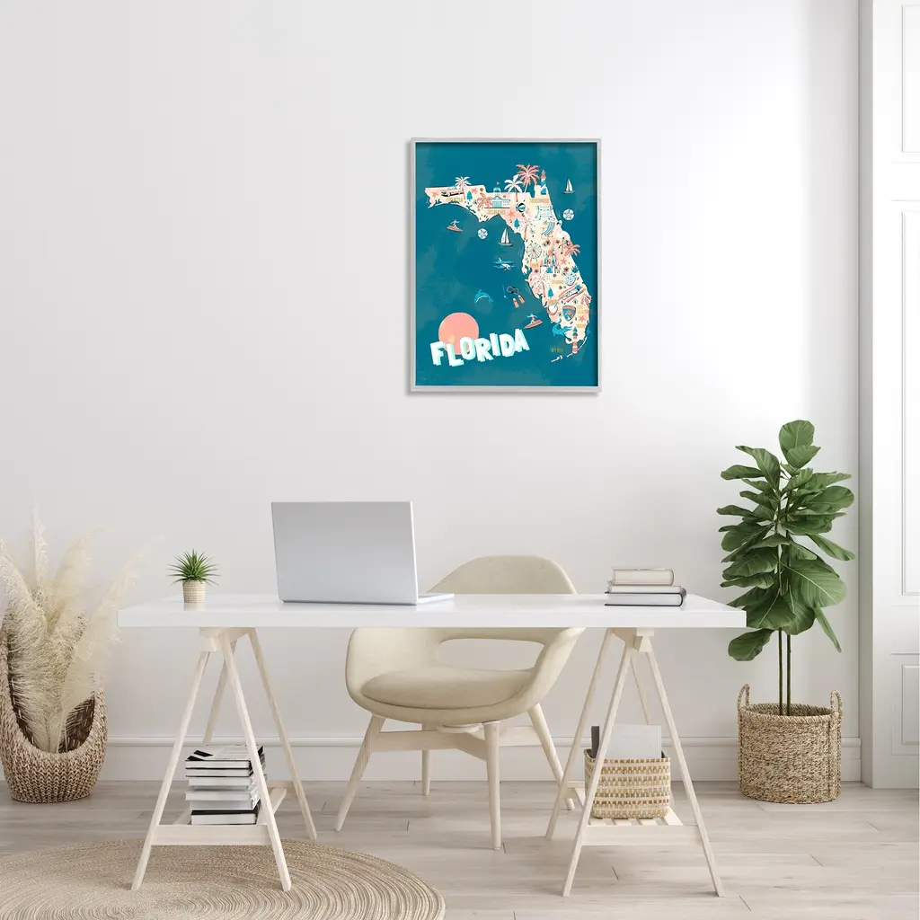 Stupell Florida Sunny State Retro Vacation Tourism Vivid Map Framed Wall Art, Design By Ziwei Li - Blue - 24 X 30 - Grey
