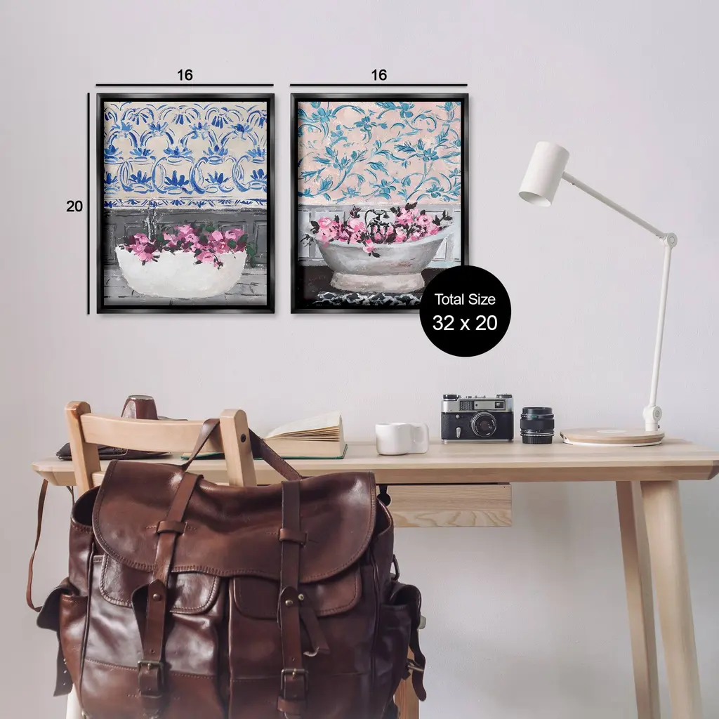Elevate your home or office to the next level with Stupell Framed Floating Canvas Wall Art. Our premium hand-stretched canvas is mounted securely into a sturdy lightweight frame. The museum-style gap between the wrapped canvas and the box frame gives the illusion of floating artwork. Stupell Wall Art is made in the USA.Features: Dimensions: 2 Piece Set, Each Frame is 17 x 1.7 x 21Two Piece Floater Framed Canvas are available as 17x21 or 25x31 Panels. All Floater Frame Products have a 1.7" Depth.Wall Art is Ready to Hang with Hardware Free Hanging. No Installation required. For Easy Set Up Lean or Layer Artwork on Shelf or Against Wall. Artwork is Permently Fixed into the Frame.Our elevated 1.7" Thick Floating Frame is the perfect complement to our canvas style Wall Art. We use only the highest quality inks in house with industry leading printing solutions. Canvas is hand stretched over a durable wood foundation and then mounted securly into a Modern Box Frame. Made in the USA.Artwork Relates To: Bathroom, Bathtub, Floral, Pattern, Blossom, VintageDesign by Melissa Wang