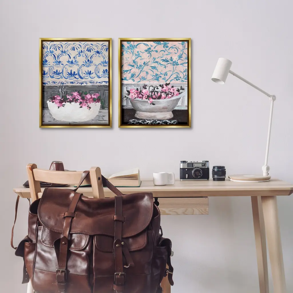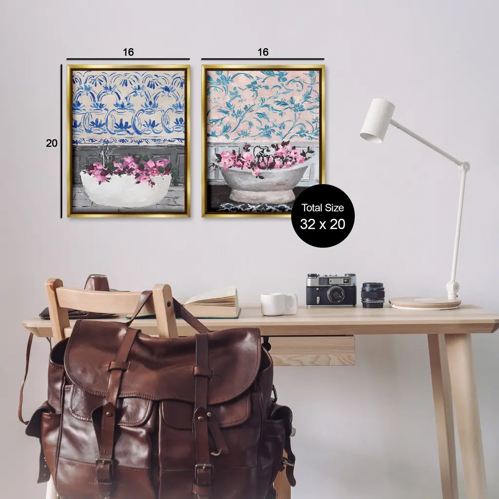 Elevate your home or office to the next level with Stupell Framed Floating Canvas Wall Art. Our premium hand-stretched canvas is mounted securely into a sturdy lightweight frame. The museum-style gap between the wrapped canvas and the box frame gives the illusion of floating artwork. Stupell Wall Art is made in the USA.Features: Dimensions: 2 Piece Set, Each Frame is 17 x 1.7 x 21Two Piece Floater Framed Canvas are available as 17x21 or 25x31 Panels. All Floater Frame Products have a 1.7" Depth.Wall Art is Ready to Hang with Hardware Free Hanging. No Installation required. For Easy Set Up Lean or Layer Artwork on Shelf or Against Wall. Artwork is Permently Fixed into the Frame.Our elevated 1.7" Thick Floating Frame is the perfect complement to our canvas style Wall Art. We use only the highest quality inks in house with industry leading printing solutions. Canvas is hand stretched over a durable wood foundation and then mounted securly into a Modern Box Frame. Made in the USA.Artwork Relates To: Bathroom, Bathtub, Floral, Pattern, Blossom, VintageDesign by Melissa Wang