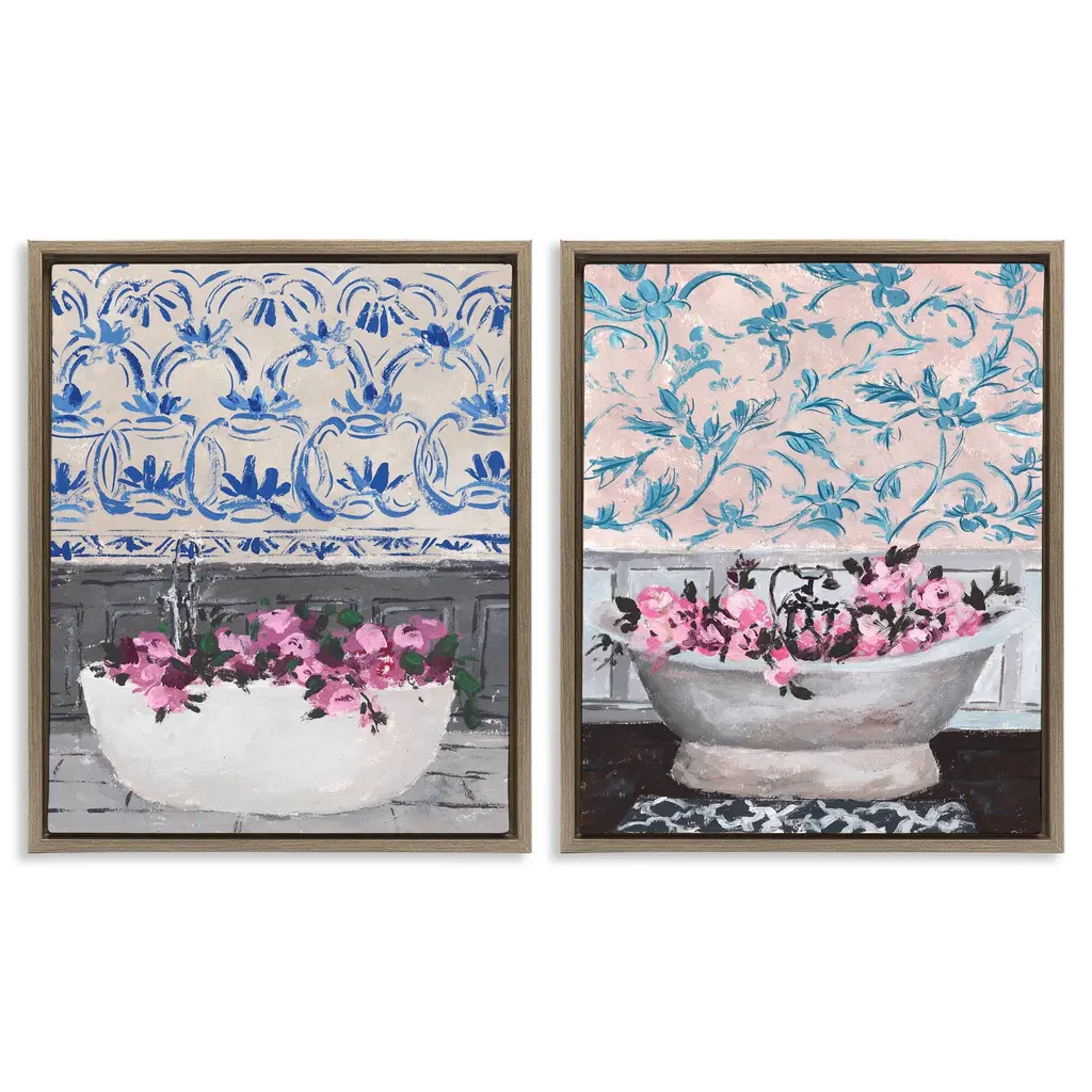 Elevate your home or office to the next level with Stupell Framed Floating Canvas Wall Art. Our premium hand-stretched canvas is mounted securely into a sturdy lightweight frame. The museum-style gap between the wrapped canvas and the box frame gives the illusion of floating artwork. Stupell Wall Art is made in the USA.Features: Dimensions: 2 Piece Set, Each Frame is 17 x 1.7 x 21Two Piece Floater Framed Canvas are available as 17x21 or 25x31 Panels. All Floater Frame Products have a 1.7" Depth.Wall Art is Ready to Hang with Hardware Free Hanging. No Installation required. For Easy Set Up Lean or Layer Artwork on Shelf or Against Wall. Artwork is Permently Fixed into the Frame.Our elevated 1.7" Thick Floating Frame is the perfect complement to our canvas style Wall Art. We use only the highest quality inks in house with industry leading printing solutions. Canvas is hand stretched over a durable wood foundation and then mounted securly into a Modern Box Frame. Made in the USA.Artwork Relates To: Bathroom, Bathtub, Floral, Pattern, Blossom, VintageDesign by Melissa Wang