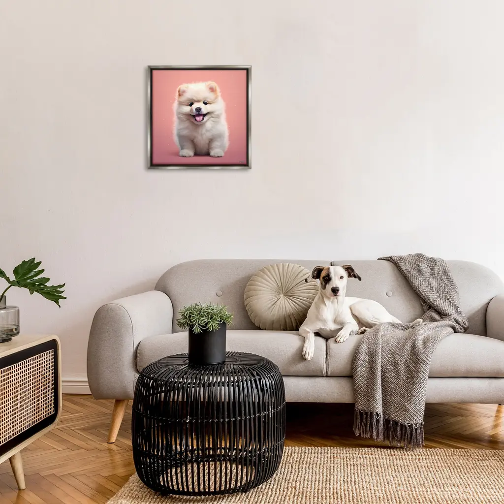Stupell Fluffy Puppy On Pink Framed Floater Canvas Wall Art Design By Rb - 25 X 25 - Grey