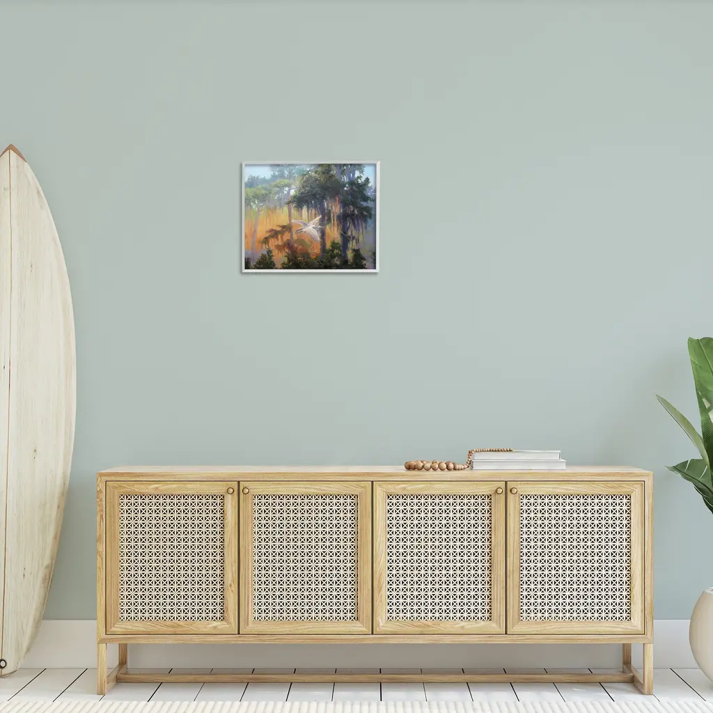Add dimension to any room with our textured Framed Giclee Artwork. Our framed artwork is securely mounted into a 1.5-inch thick wood grain frame and ready to hang. Frames are available in three alluring styles: black, gray farmhouse and white. In addition, you should check out our oversized options if you want a statement piece. Stupell Wall Art is made in the USA.Features: Dimensions: 14 x 1.5 x 11 FramedFramed Giclee Products are available in the sizes 14"x11", 20"x16" or 30"x24". All Framed Giclee Products have a 1.5" Depth. Wall Art is Ready to Hang with Hardware Free Hanging. No installation required. For Easy Set Up Lean or Layer Artwork on Shelf or Against Wall.Our giclée prints are carefully mounted on a durable MDF backing, and then perfectly finished in a 1.5 inch thick woodgrain frame. Mounted frame colors include black, gray farmhouse and white. Made In USA.Artwork Relates To: Animal, Beak, Bird, Waterfowl, Painting, Plant, Crane Bird, Trees, Landscape, EgretDesign by Sandy Nelson