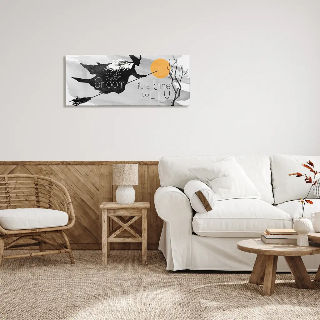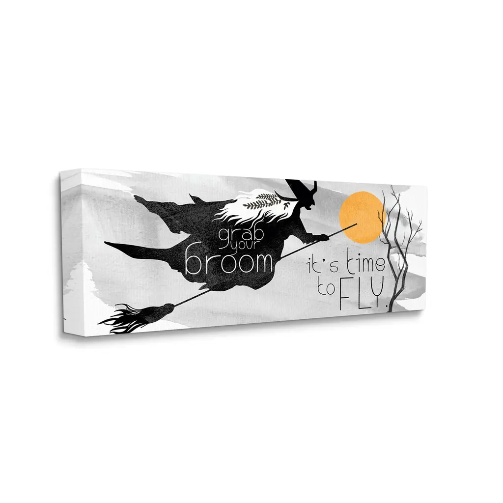 Stupell Flying Witch Broom Typography Nighttime Halloween Sky Canvas Wall Art - Orange - 40 X 17