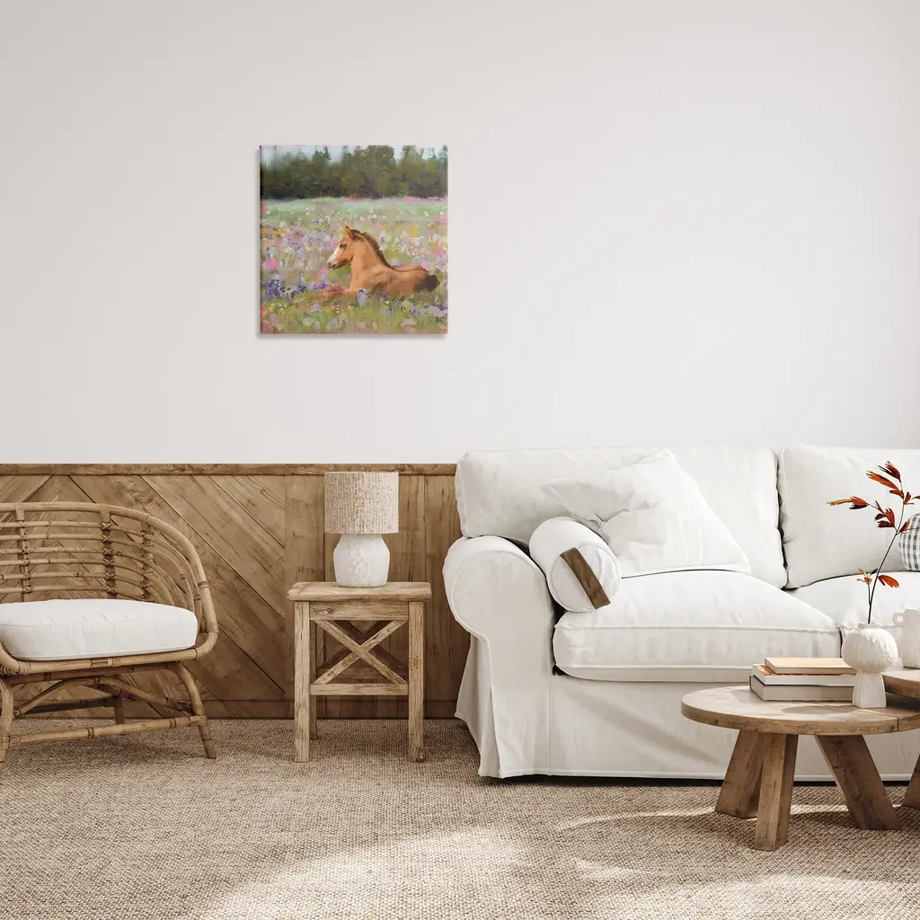 We create our stretched canvas to the highest standards. Using only the highest quality inks and canvas on Mimaki printers, we hand-cut and stretch each piece over a 1.5-inch thick wooden frame for hanging. As a result, the art comes ready to hang on the sturdy ledge with no installation required. Stupell Wall Art is made in the USA.Features: Dimensions: 17 x 1.5 x 17 InchesStretched Canvas Sizes Include Standard: 17 x 1.5 x 17 Large: 24 x 1.5 x 24 X-Large: 30 x 1.5 x 30 Oversized: 36 x 1.5 x 36Wall Art is Ready to Hang - No Installation or Hardware Needed. For Easy Set Up Lean or Layer Artwork on Shelf or Against Wall.Our stretched canvas is created with the highest standards. We use only the highest quality inks and canvas on our in house Mimaki printers, and then hand cut and stretch each piece over a 1.5 inch thick wooden frame for hanging. Made In USA.Artwork Relates To: Animal, Colt Horse, Horse, Mammal, Foal, Painting, Flower, Plant, Field, Grassland, Nature, MeadowDesign by Nina Blue