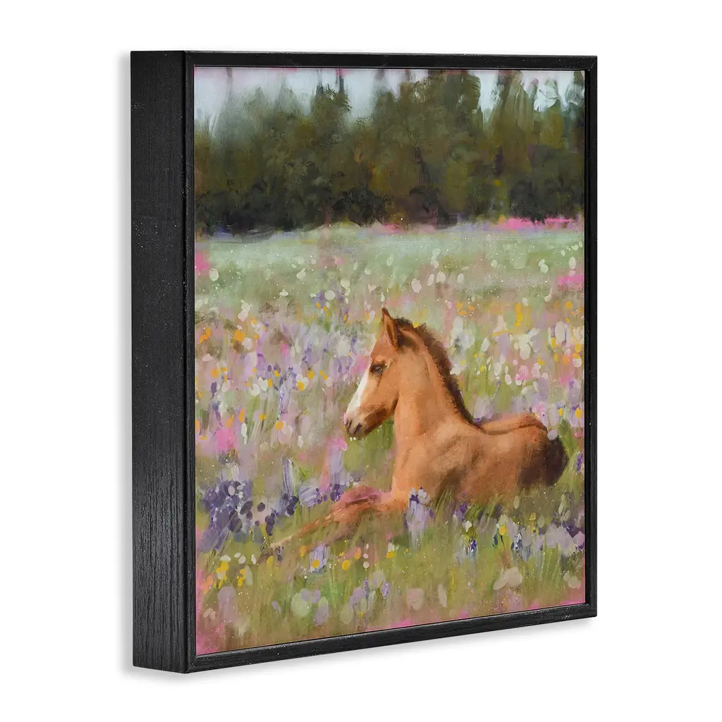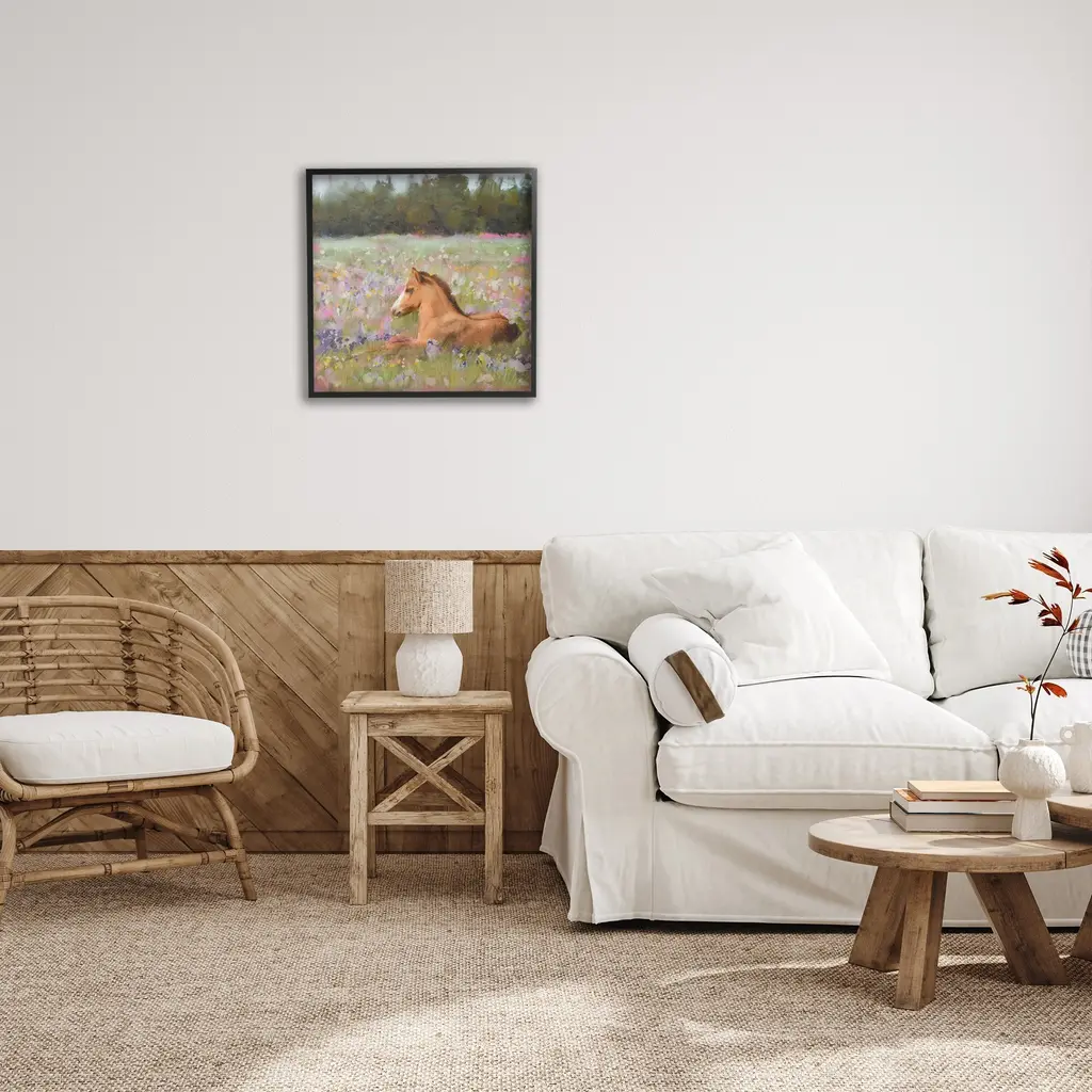 Add dimension to any room with our textured Framed Giclee Artwork. Our framed artwork is securely mounted into a 1.5-inch thick wood grain frame and ready to hang. Frames are available in three alluring styles: black, gray farmhouse and white. In addition, you should check out our oversized options if you want a statement piece. Stupell Wall Art is made in the USA.Features: Dimensions: 12 x 1.5 x 12 FramedFramed Giclee Sizes Include Standard: 12 x 1.5 x 12 Large: 17 x 1.5 x 17 Oversized: 24 x 1.5 x 24Wall Art is Ready to Hang - No Installation or Hardware Needed. For Easy Set Up Lean or Layer Artwork on Shelf or Against Wall.Our giclée prints are carefully mounted on a durable MDF backing, and then perfectly finished in a 1.5 inch thick woodgrain frame. Mounted frame colors include black, gray farmhouse and white. Made In USA.Artwork Relates To: Animal, Colt Horse, Horse, Mammal, Foal, Painting, Flower, Plant, Field, Grassland, Nature, MeadowDesign by Nina Blue