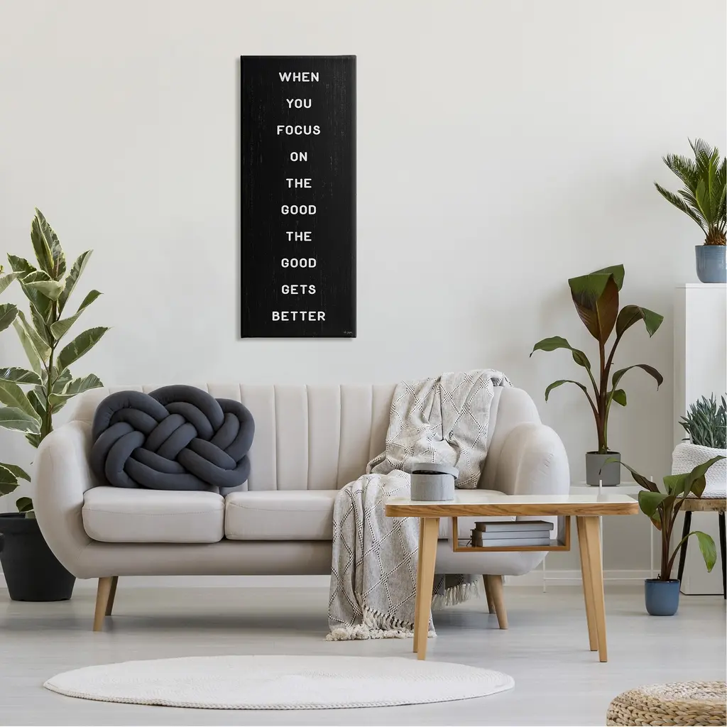 We create our stretched canvas to the highest standards. Using only the highest quality inks and canvas on Mimaki printers, we hand-cut and stretch each piece over a 1.5-inch thick wooden frame for hanging. As a result, the art comes ready to hang on the sturdy ledge with no installation required. Stupell Wall Art is made in the USA.Features: Dimensions: 10 x 1.5 x 24 InchesStretched Canvas Sizes Include Standard: 10 x 1.5 x 24 Large: 13 x 1.5 x 30 X-Large: 17 x 1.5 x 40 Oversized: 20 x 1.5 x 48Wall Art is Ready to Hang with Hardware Free Hanging. No installation required. For Easy Set Up Lean or Layer Artwork on Shelf or Against Wall.Our stretched canvas is created with the highest standards. We use only the highest quality inks and canvas on our in house Mimaki printers, and then hand cut and stretch each piece over a 1.5 inch thick wooden frame for hanging. Made In USA.Artwork Relates To: Phrase, Black, Rustic, When You Focus On The Good The Good Gets BetterDesign by Jaxn Blvd.