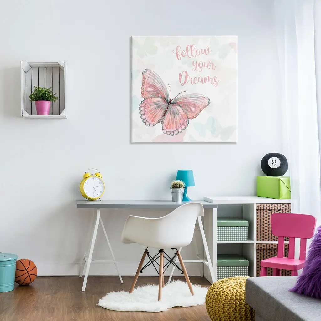Proudly made in the USA, Our stretched canvas is created with the highest standards. We use only the highest quality inks and canvas on our in house Mimaki printers, and then hand cut and stretch each piece over a 1.5 inch thick wooden frame for hanging. The art comes ready to hang with no installation required.Features: Dimensions: 17 x 1.5 x 17 InchesStretched Canvas Sizes Include Standard: 17 x 1.5 x 17 Large: 24 x 1.5 x 24 X-Large: 30 x 1.5 x 30 Oversized: 36 x 1.5 x 36Wall Art is Ready to Hang - No Installation or Hardware Needed. For Easy Set Up Lean or Layer Artwork on Shelf or Against Wall.Our stretched canvas is created with the highest standards. We use only the highest quality inks and canvas on our in house Mimaki printers, and then hand cut and stretch each piece over a 1.5 inch thick wooden frame for hanging. Made In USA.Artwork Relates To: Animal, Butterfly, Insect, PatternDesign by Carol RobinsonKid's Room, Nursery, Playroom, Classroom or Kid's Bedroom.Text Includes: Follow Your Dreams