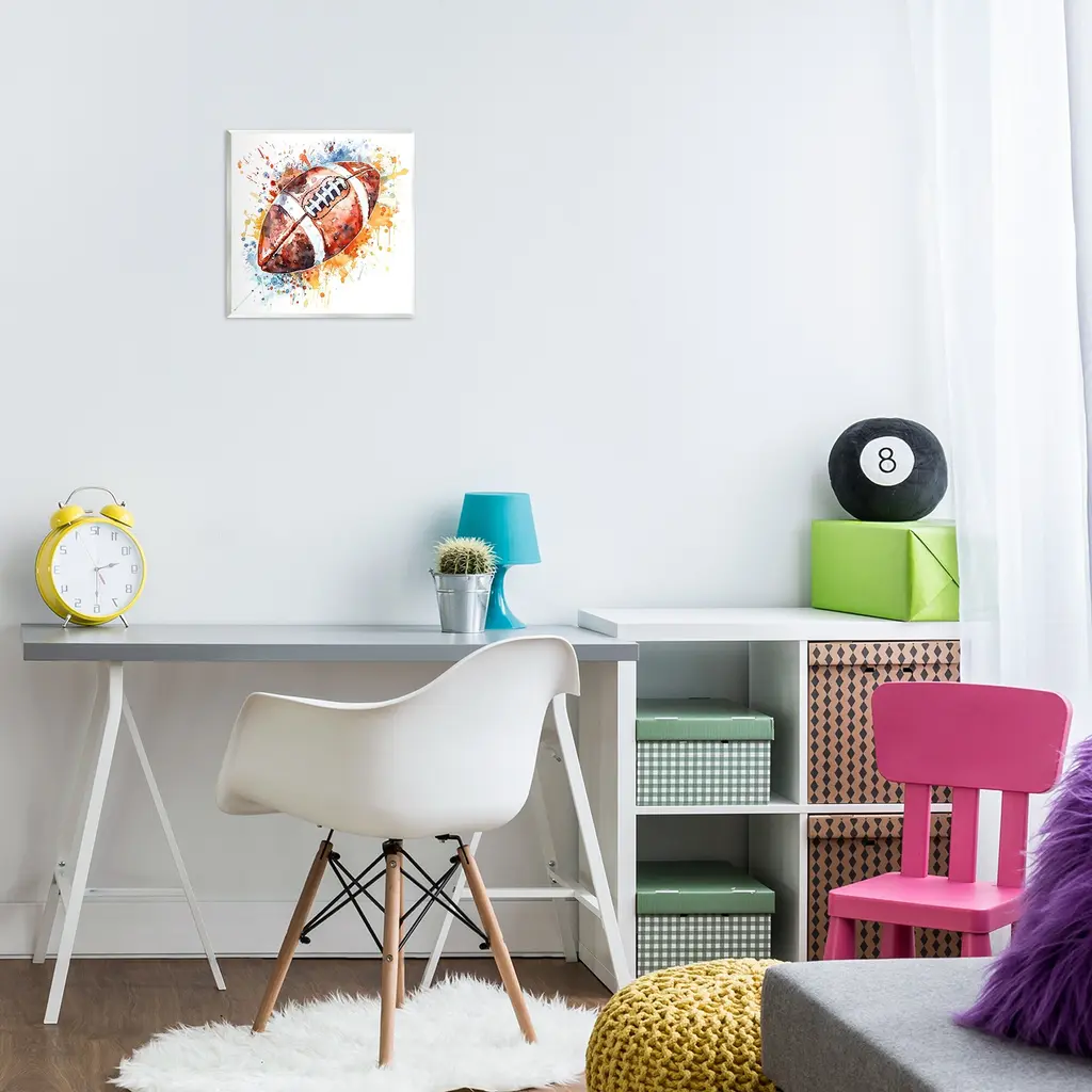 Our wall plaques start as high-quality lithograph prints mounted on durable 0.5-inch thick MDF wood. Each piece is hand finished and comes with a fresh layer of white foil on the sides to give it a crisp, clean look. Plaques arrive ready to hang without installation and come with removable plastic corners to keep them from damage in transit. Stupell Wall Art is made in the USA.Features: Dimensions: 12 x 0.5 x 12 InchesWall Art is Ready to Hang with Hardware Free Hanging. No installation required. For Easy Set Up Lean or Layer Artwork on Shelf or Against Wall.All of our wall plaques start off as high quality lithograph prints that are then mounted on durable 0.5 inch thick MDF wood. Each piece is hand finished and comes with a fresh layer of foil on the sides to give it a crisp clean look. Made In USA.Artwork Relates To: Sport, Ball, Modern, Abstract, Splash, FootballDesign by LSR Design Studio