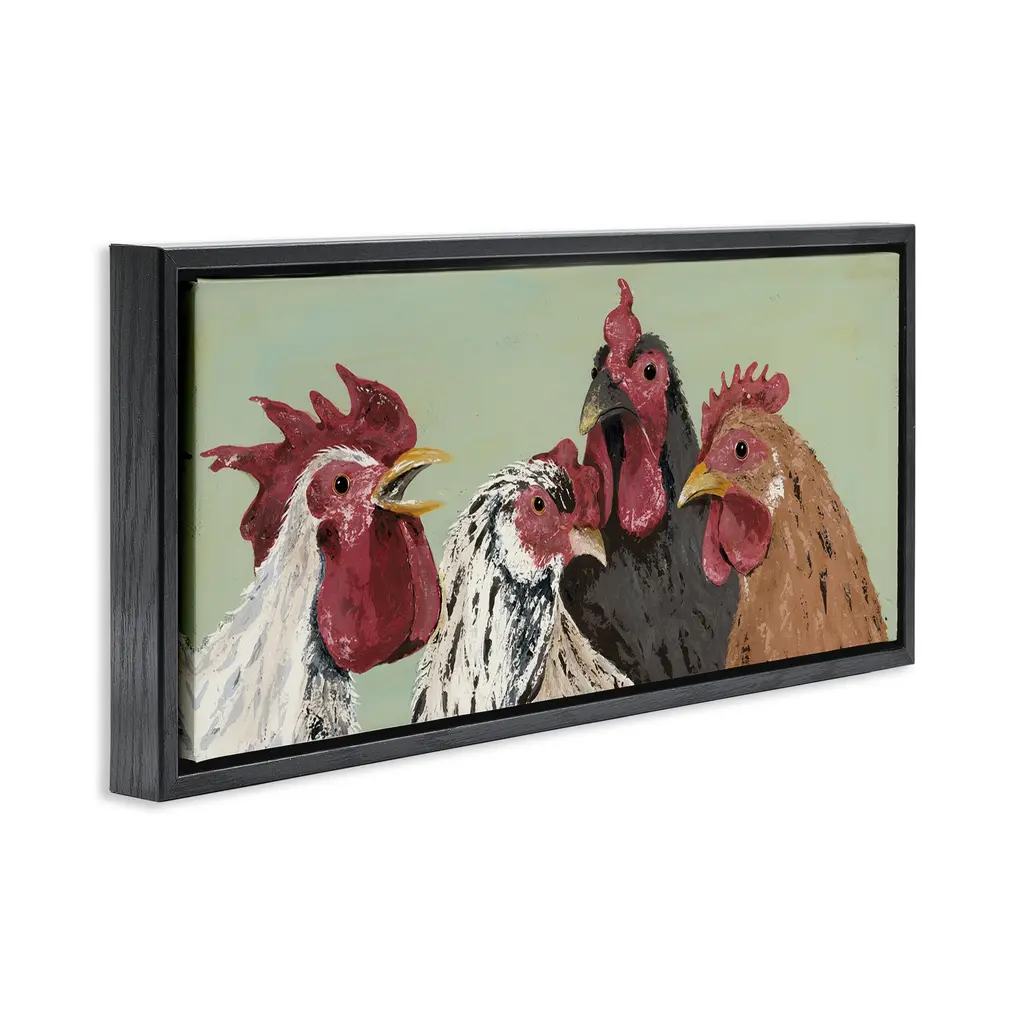 Elevate your home or office to the next level with Stupell Framed Floating Canvas Wall Art. Our premium hand-stretched canvas is mounted securely into a sturdy lightweight frame. The museum-style gap between the wrapped canvas and the box frame gives the illusion of floating artwork. Stupell Wall Art is made in the USA.Features: Dimensions: 25 x 1.7 x 11 Frame, 24 x 1.5 x 10 Canvas ArtFloating Frame Canvas Products are available in sizes 25"x11" and 31"x14". All Floating Frame Canvas Products have a 1.7" Depth.Wall Art is Ready to Hang with Hardware Free Hanging. No Installation required. For Easy Set Up Lean or Layer Artwork on Shelf or Against Wall. Artwork is Permently Fixed into the Frame.Our elevated 1.7" Thick Floating Frame is the perfect complement to our canvas style Wall Art. We use only the highest quality inks in house with industry leading printing solutions. Canvas is hand stretched over a durable wood foundation and then mounted securly into a Modern Box Frame. Made in the USA.Artwork Relates To: Country, Animal, Farmhouse, Rooster, Chicken, HenDesign by Jade Reynolds