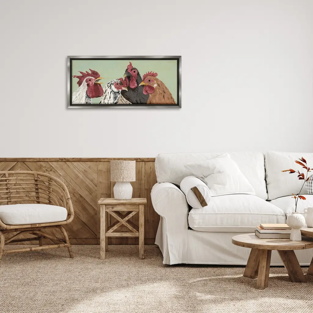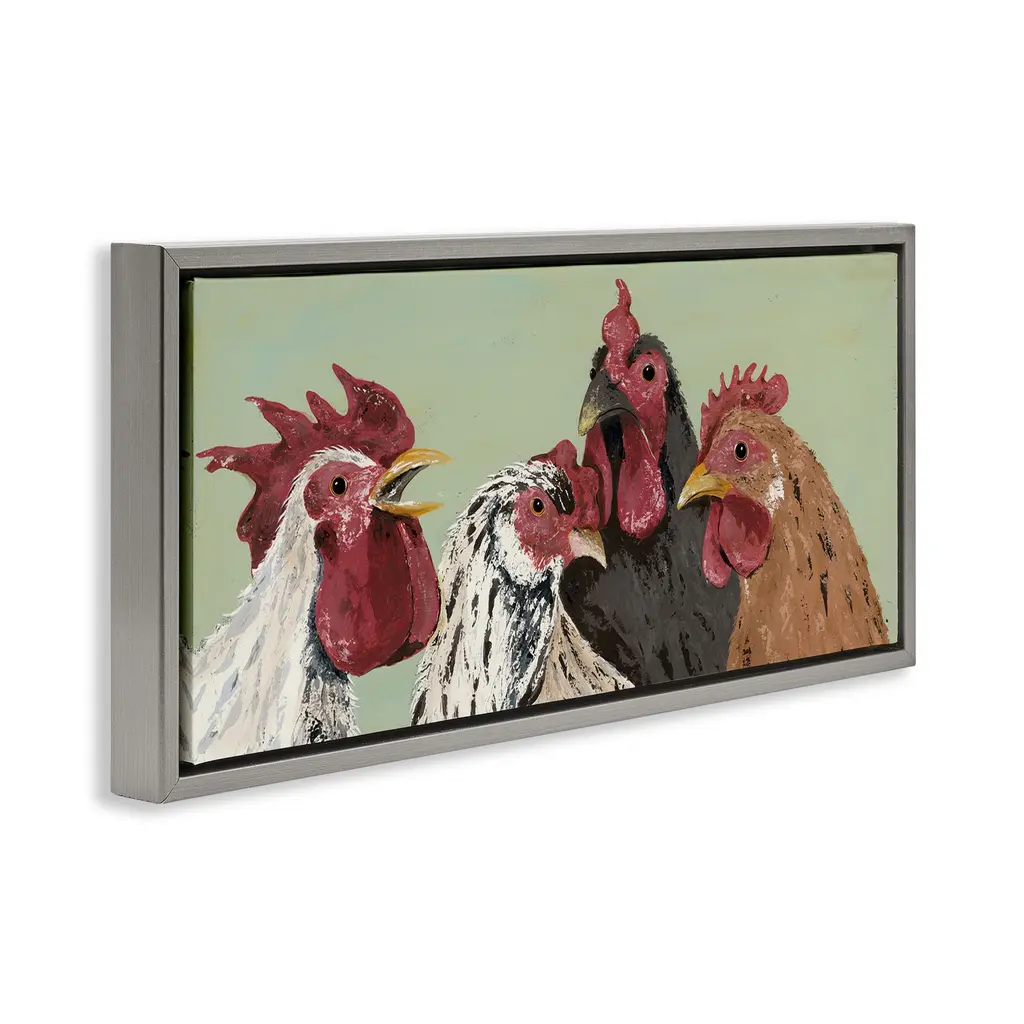Elevate your home or office to the next level with Stupell Framed Floating Canvas Wall Art. Our premium hand-stretched canvas is mounted securely into a sturdy lightweight frame. The museum-style gap between the wrapped canvas and the box frame gives the illusion of floating artwork. Stupell Wall Art is made in the USA.Features: Dimensions: 25 x 1.7 x 11 Frame, 24 x 1.5 x 10 Canvas ArtFloating Frame Canvas Products are available in sizes 25"x11" and 31"x14". All Floating Frame Canvas Products have a 1.7" Depth.Wall Art is Ready to Hang with Hardware Free Hanging. No Installation required. For Easy Set Up Lean or Layer Artwork on Shelf or Against Wall. Artwork is Permently Fixed into the Frame.Our elevated 1.7" Thick Floating Frame is the perfect complement to our canvas style Wall Art. We use only the highest quality inks in house with industry leading printing solutions. Canvas is hand stretched over a durable wood foundation and then mounted securly into a Modern Box Frame. Made in the USA.Artwork Relates To: Country, Animal, Farmhouse, Rooster, Chicken, HenDesign by Jade Reynolds