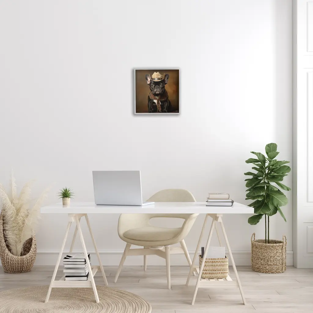 Add dimension to any room with our textured Framed Giclee Artwork. Our framed artwork is securely mounted into a 1.5-inch thick wood grain frame and ready to hang. Frames are available in three alluring styles: black, gray farmhouse and white. In addition, you should check out our oversized options if you want a statement piece. Stupell Wall Art is made in the USA.Features: Dimensions: 12 x 1.5 x 12 FramedFramed Giclee Product Sizes Include 12"x12", 17"x17", and 24"x24". Framed Giclee Products have a 1.5" Depth. Wall Art is Ready to Hang with Hardware Free Hanging. No installation required. For Easy Set Up Lean or Layer Artwork on Shelf or Against Wall.Our giclée prints are carefully mounted on a durable MDF backing, and then perfectly finished in a 1.5 inch thick woodgrain frame. Mounted frame colors include black, gray farmhouse and white. Made In USA.Artwork Relates To: Animal, Mammal, Cowboy Hat, Fashion, Southwestern, Cowboy, Pet, Dog, French BulldogDesign by RB